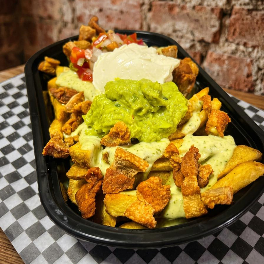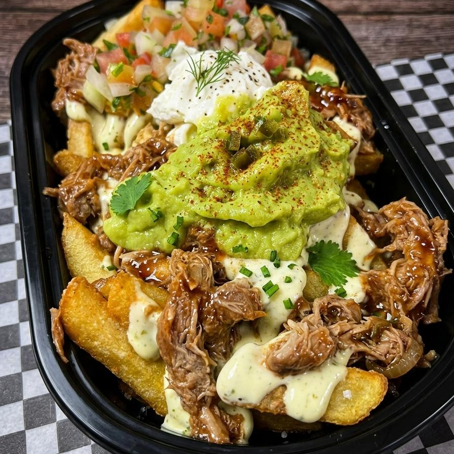 Pulled pork Chicharrón Tocineta Papa francesa artesanal Guacamole Sour cream Pico e’ gallo