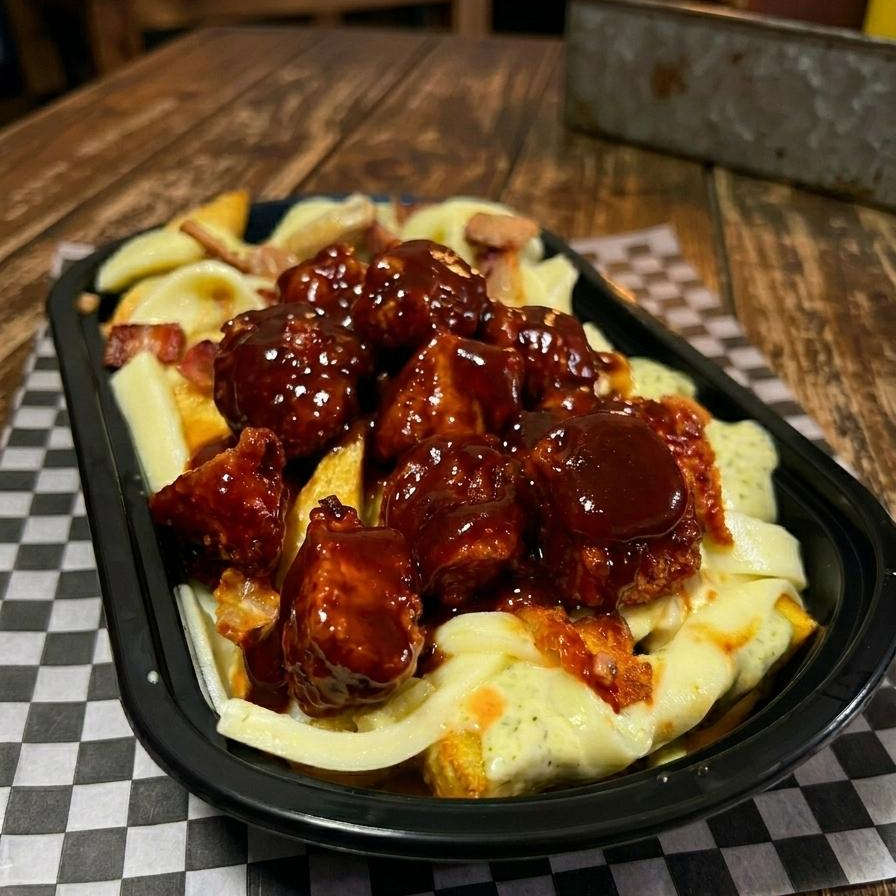 Pollo crunchy en salsa bbq Tocineta Queso mozzarella Papa francesa artesanal Salsa rosada de la casa Salsa el bajón