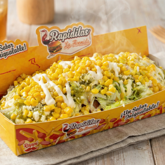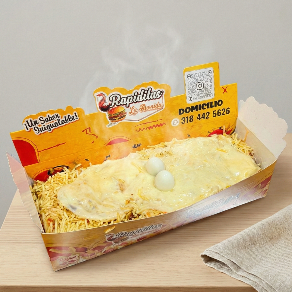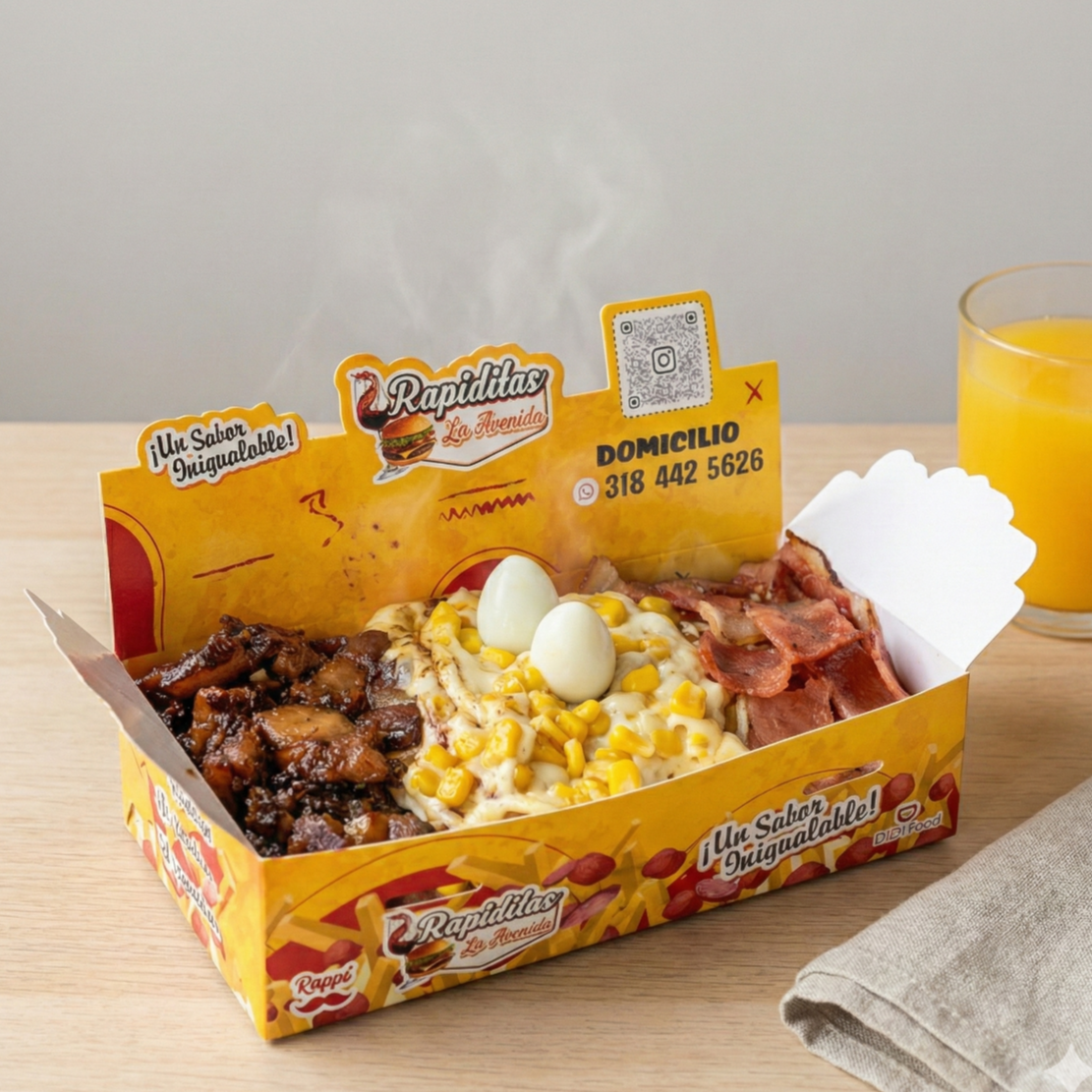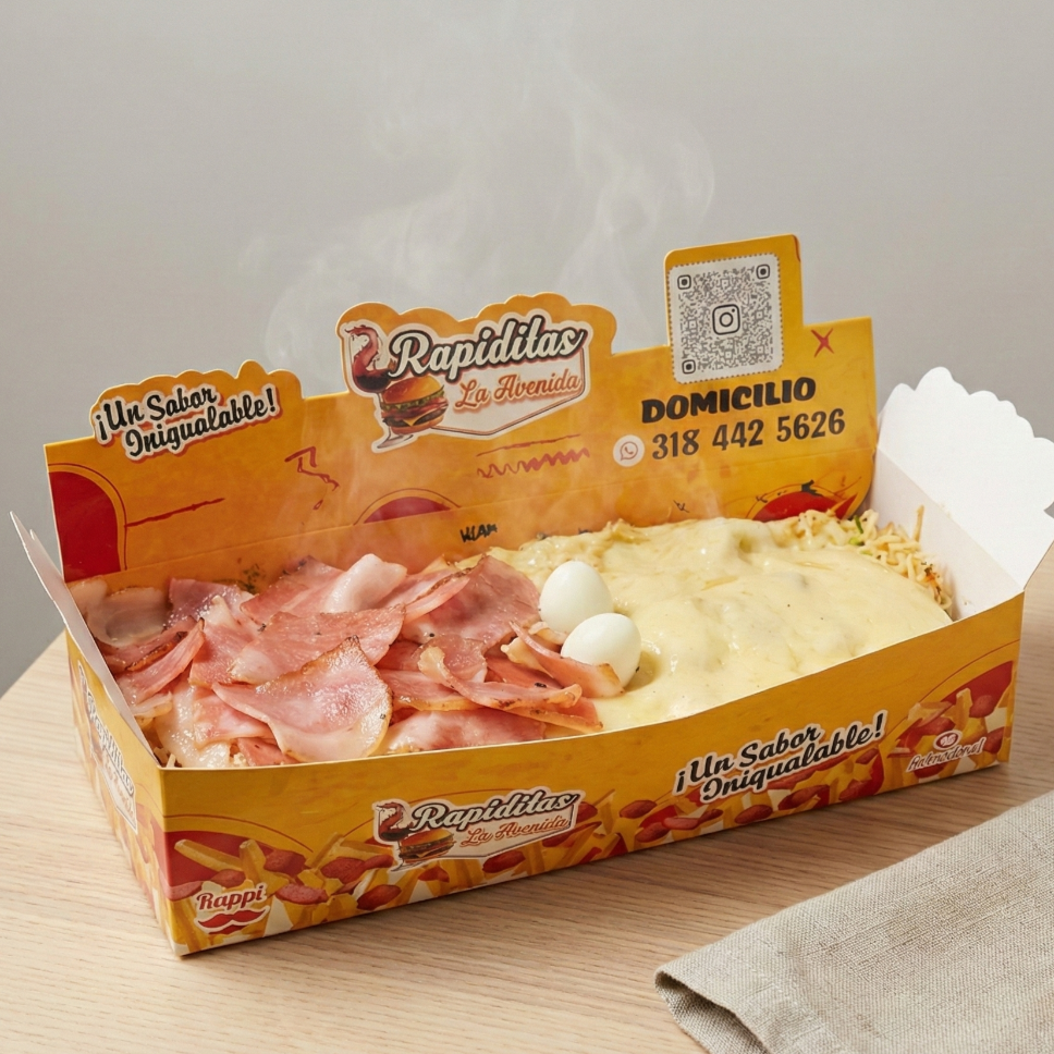 300 gramos de papa (aprox), 200 gramos de salchicha (aprox), carne desmechada, maicitos, queso, salsas, chips de papa, huevo de codorniz.