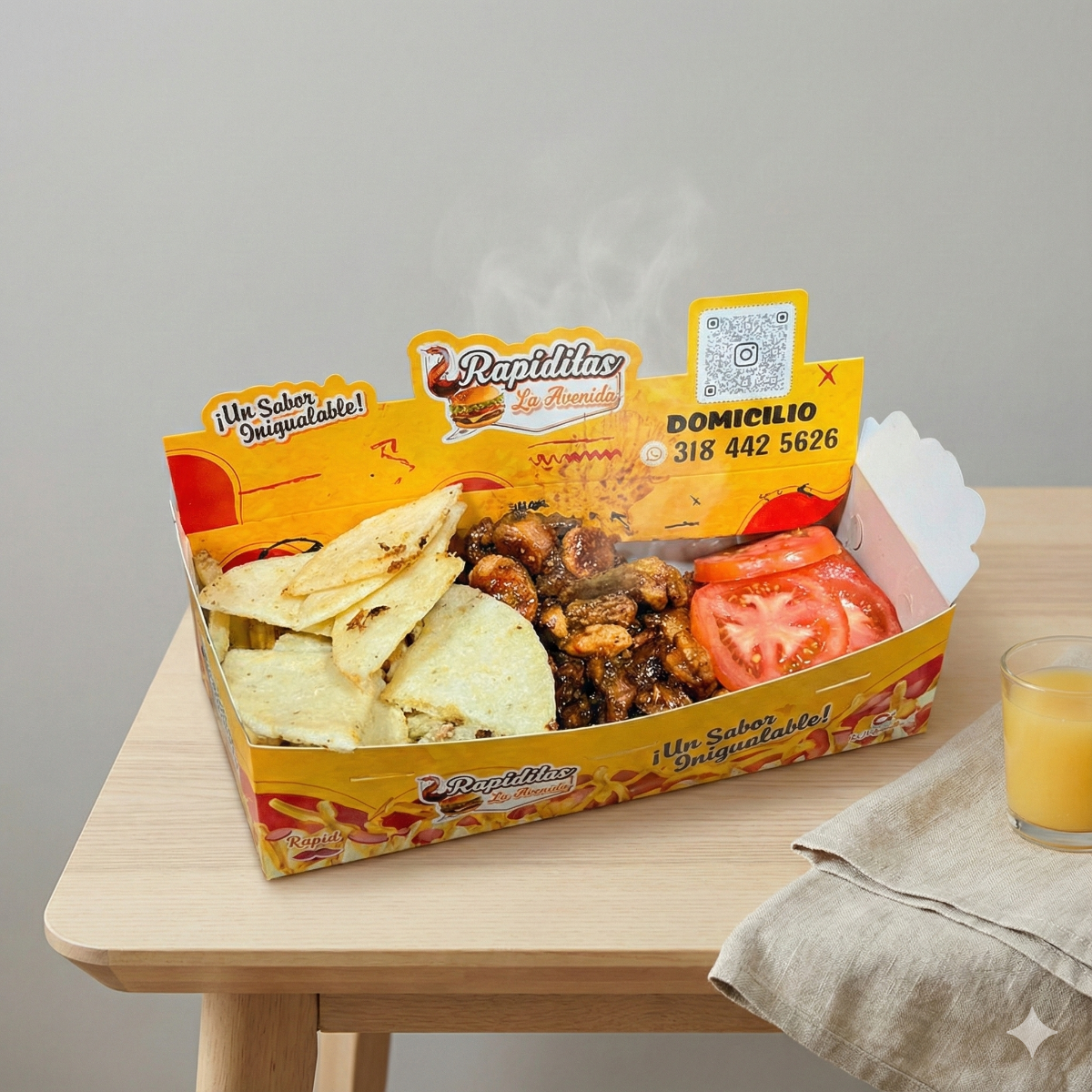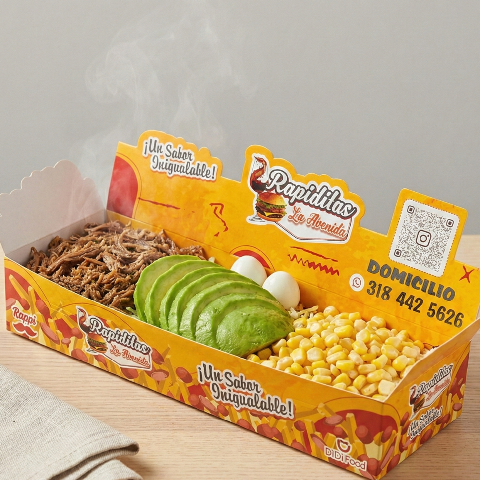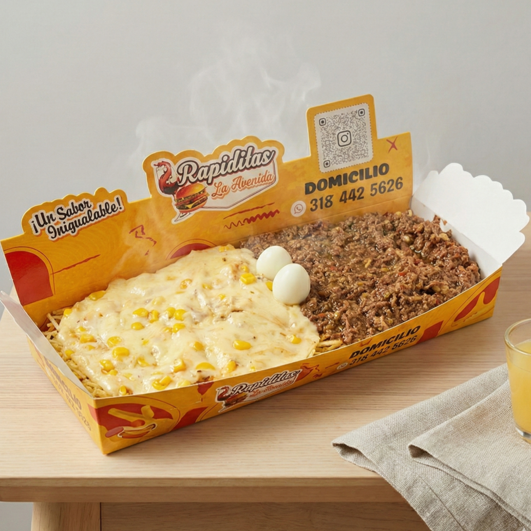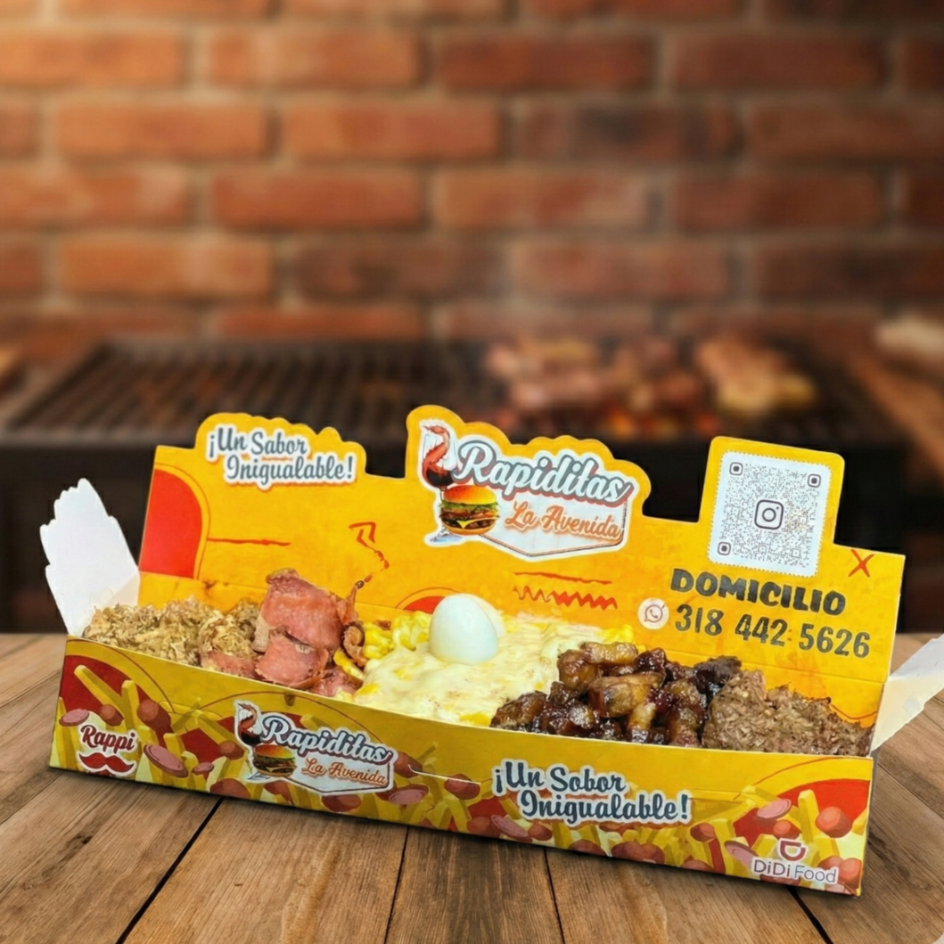 300 gramos de papa (aprox), 200 gramos de salchicha (aprox), carne desmechada, maicitos, queso, salsas, chips de papa, huevo de codorniz.