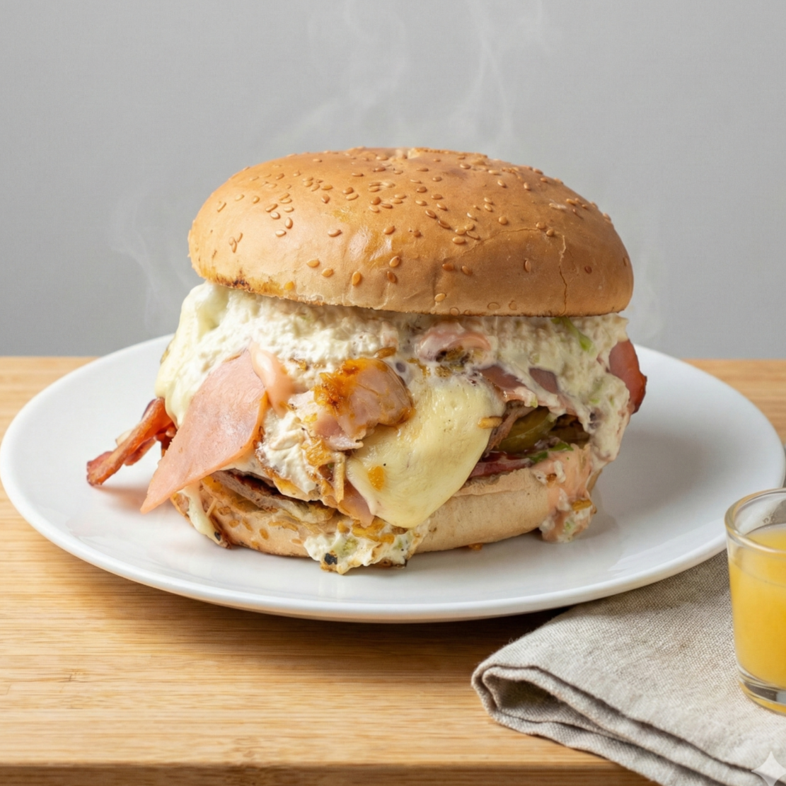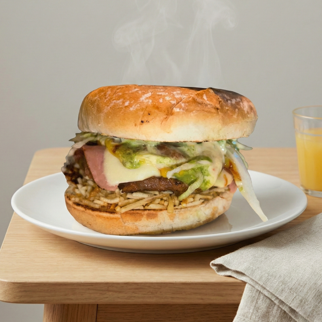 Pan tierno, doble carne artesanal, doble tocineta, doble jamón, doble queso, chips de papa, vegetales, salsas, acompañado de papas a la francesas.