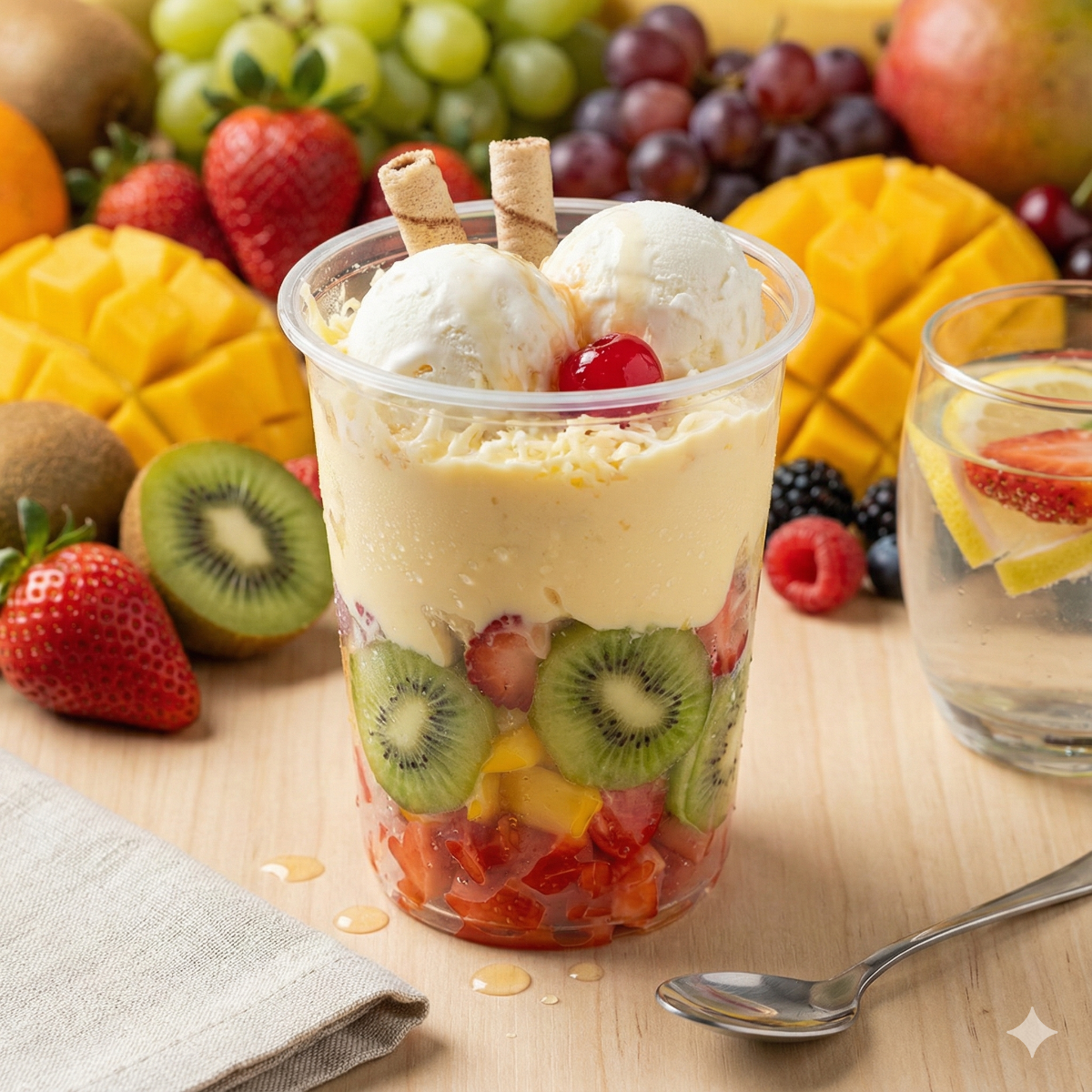 Papaya, Piña, Banano, Mango, Fresa, Kiwi, Crema de la casa, Queso 2 bolas de helado, Cereza, Barquillos