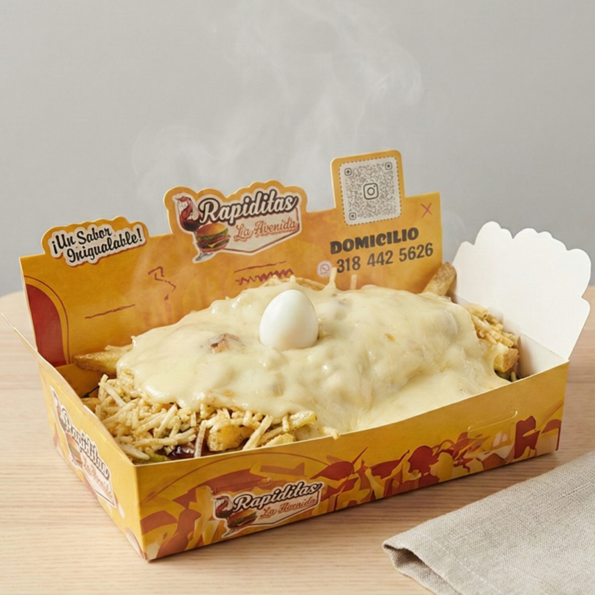 500gr de papas a la francesas aprox, pollo desmechado, aguacate, maicitos, queso, chips de papa, huevo de codorniz, salsas.