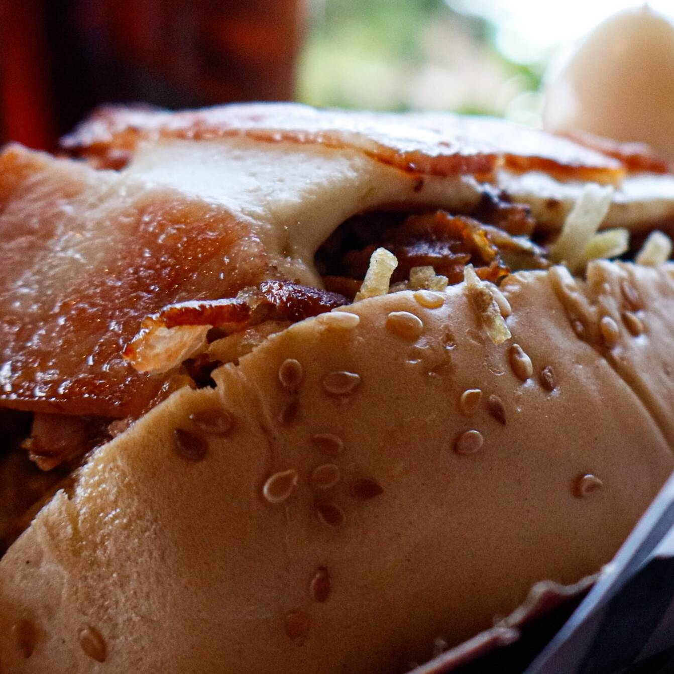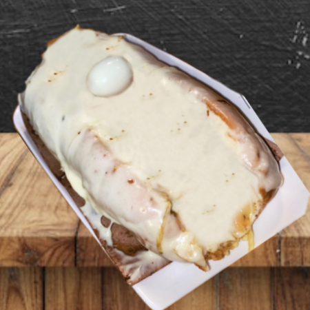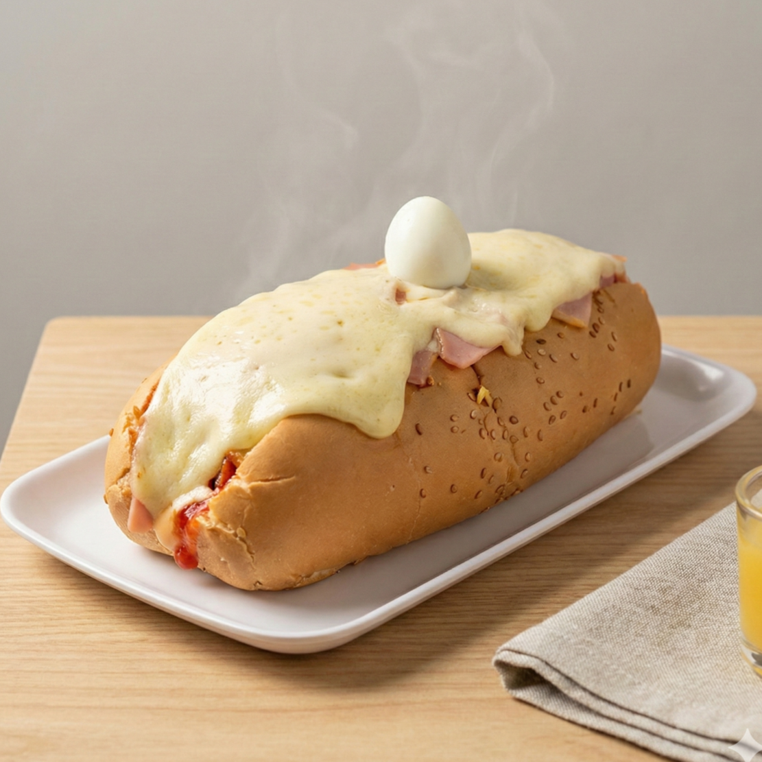 Pan tierno, jamón, queso, tocineta, pollo desmechado, vegetales, salsas.