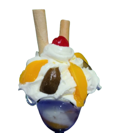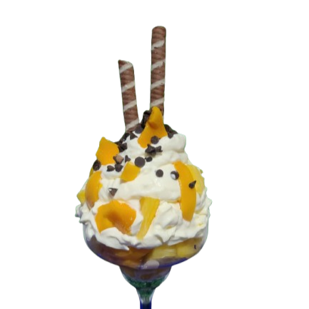 1 bola de helado, durazno, fresa, banano, chantilly, barquillos, 1 cereza.