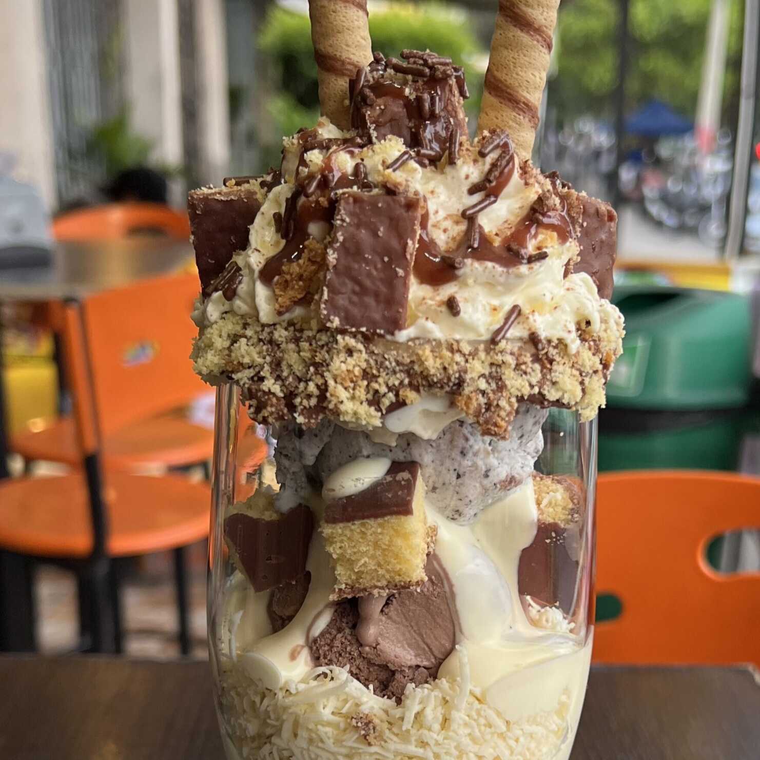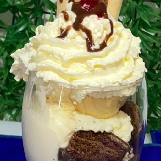 3 bolas de helado, brownie en trozos, chantilly, barquillos, cereza.