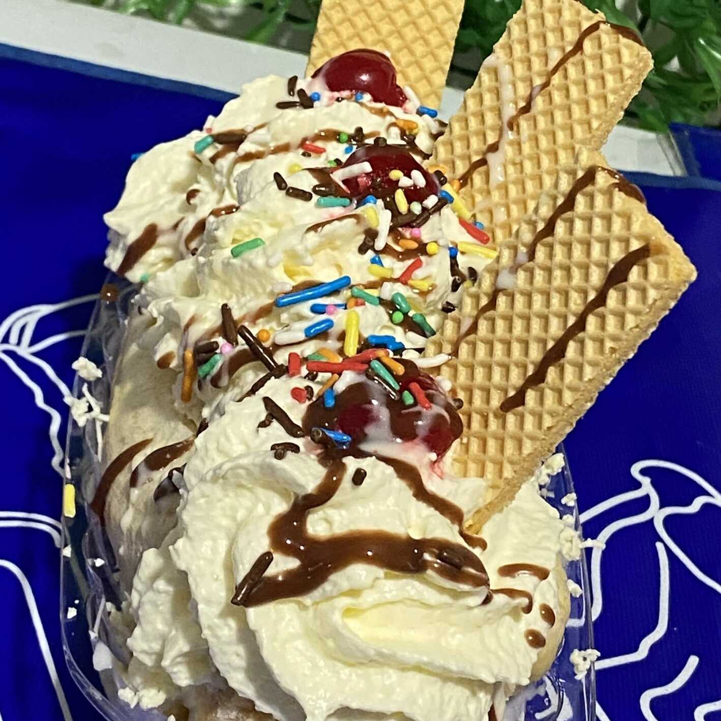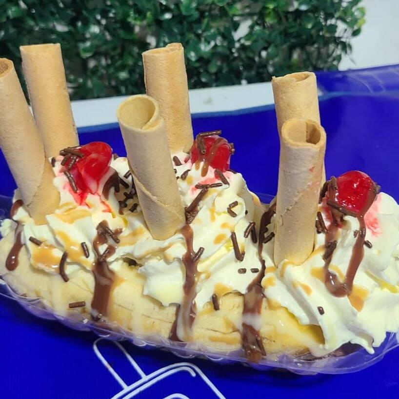 3 bolas de helado, banano, chantilly, cerezas, barquillos, chips de chocolate.