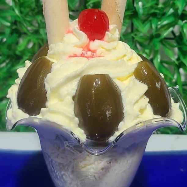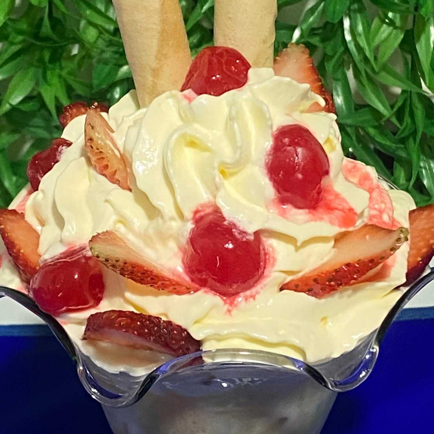 durazno, brevas, 2 bolas de helado, chantilly, barquillos, 1 cereza.