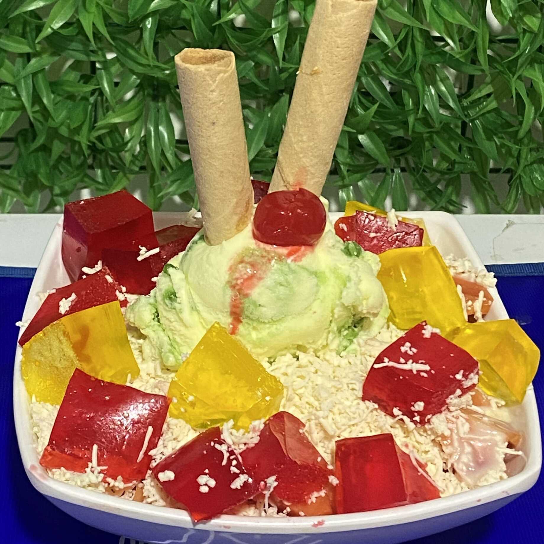 papaya, banano, manzana verde y roja, fresa, queso, gelatina, 1 bola de helado, barquillos, crema de la casa, 1 cereza.