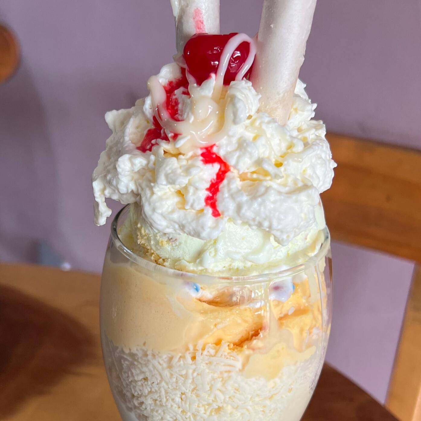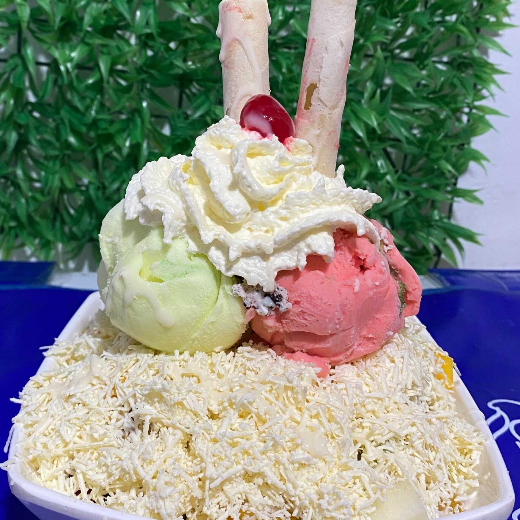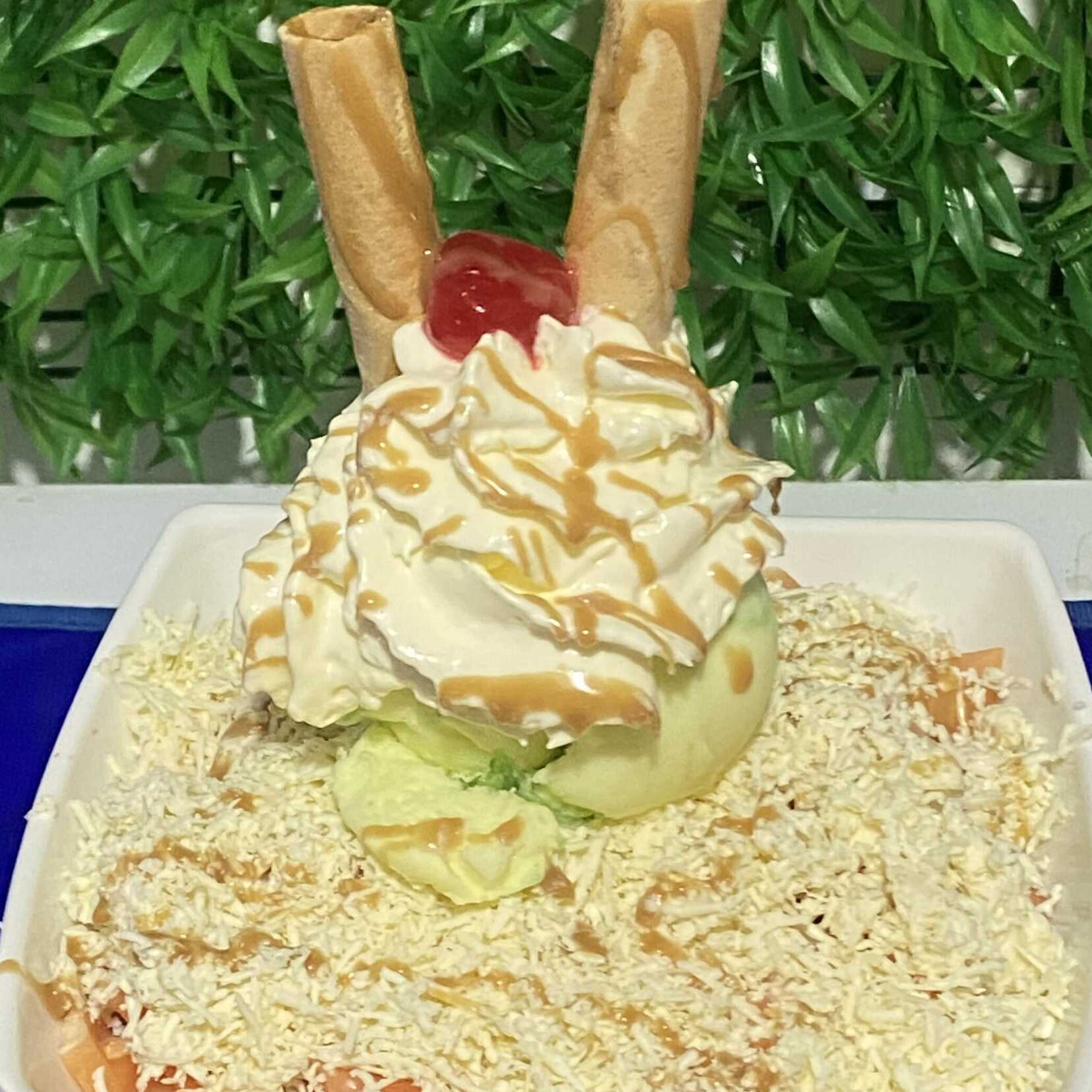 3 bolas de helado segun disponibilidad, queso, chantilly, galleta wafer, cereza, banano, chips de colores y chocolate.