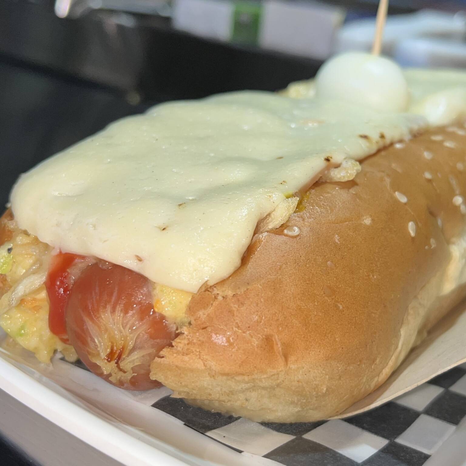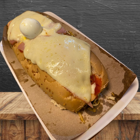 Pan tierno, salchicha zenú, jamón, extra queso, tocineta, chips de papa, huevo de codorniz, salsas.