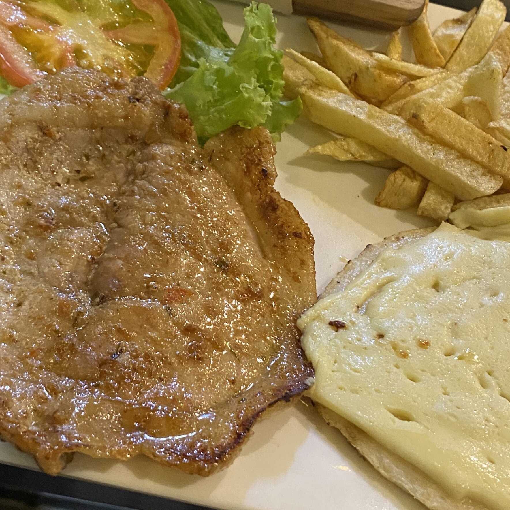 Arepa con queso, papas fritas, ensalada