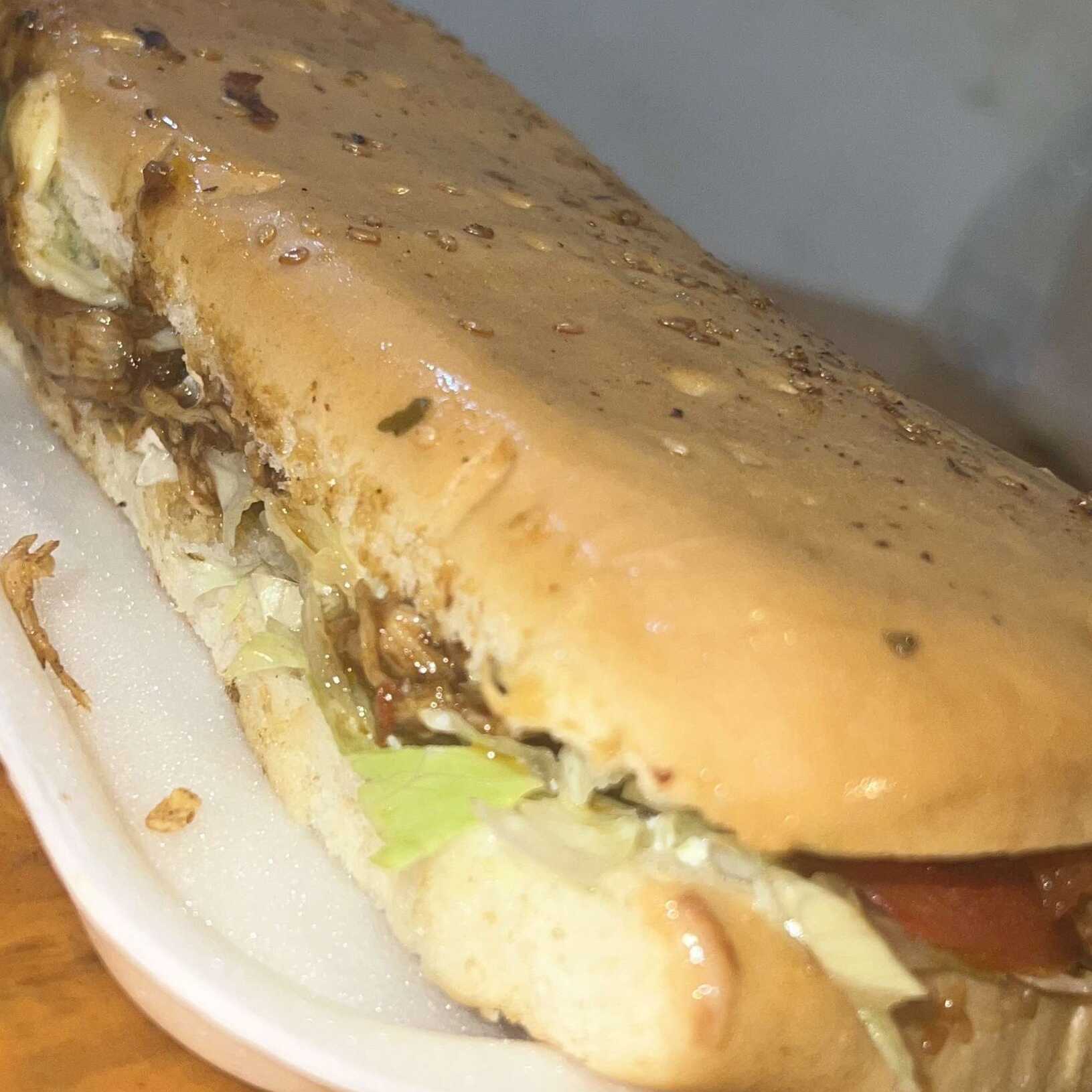 Pan tierno, jamón, queso, vegetales, salsas.