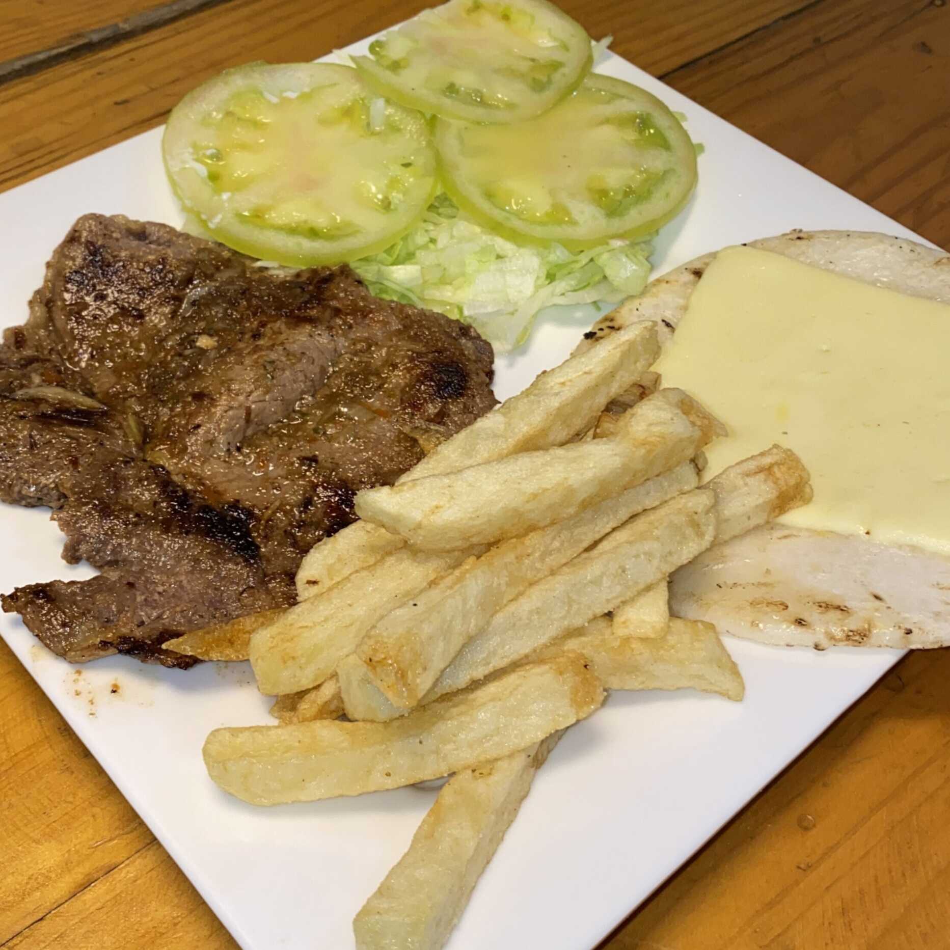 Arepa con queso, ensalada, papas fritas.