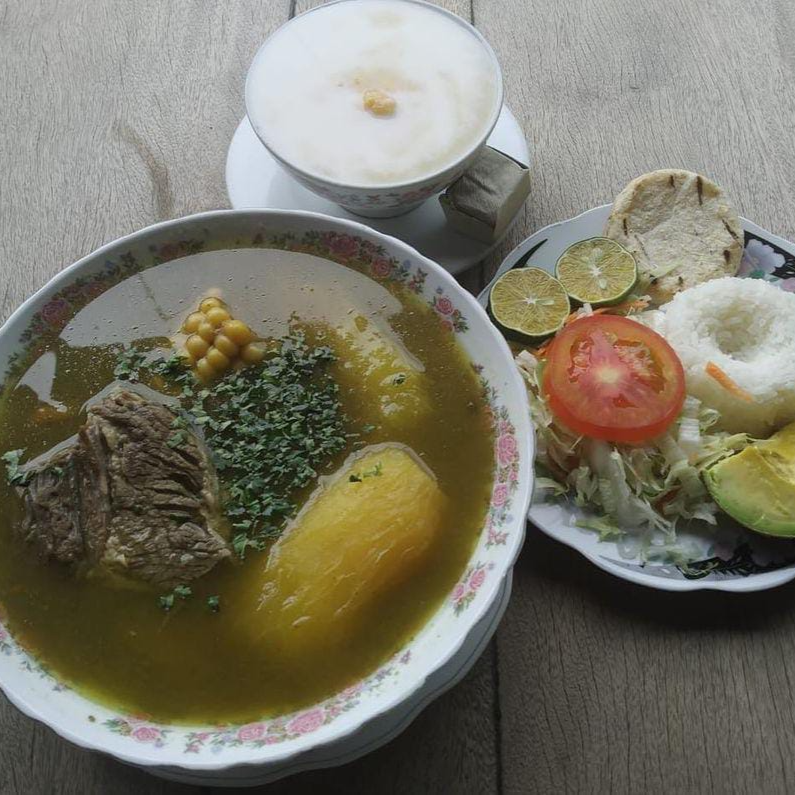 Sopita de sancocho, frijol, arroz, huevo, maduro y arepita, opcional ensalada (lechuga, zanahoria, tomate).