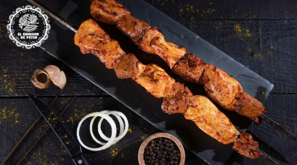 Cerdo, papas rústicas, arepa de maíz, queso mozzarella, gratinado, ensalada (repollo y zanahoria), salsa de la casa.