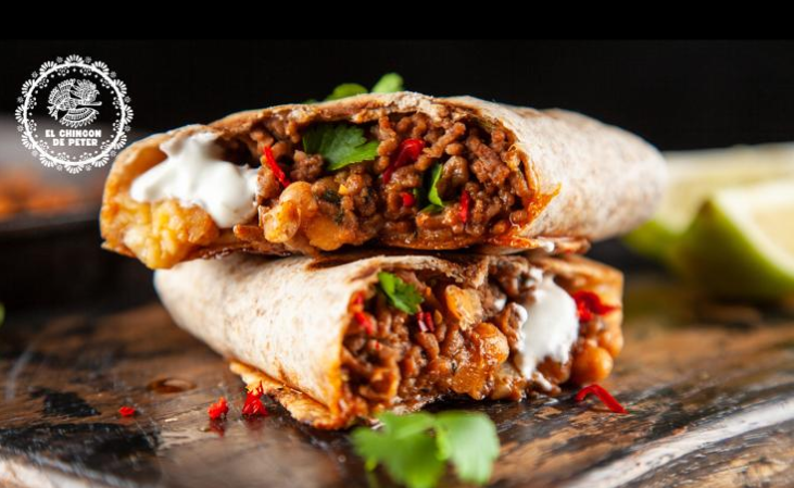 Tortillas de trigo, porción carne res, arroz rojo, frijoles refritos, salsa roja y/o verde.