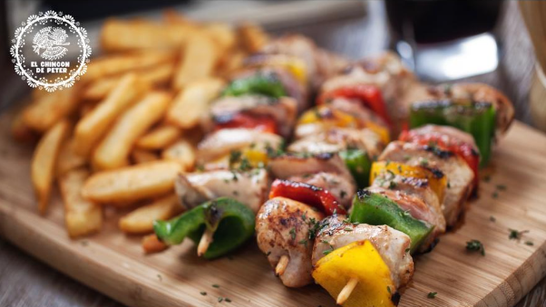 Pollo, papas rústicas, arepa de maíz, queso mozzarella, gratinado, ensalada (repollo y zanahoria), salsa de la casa.