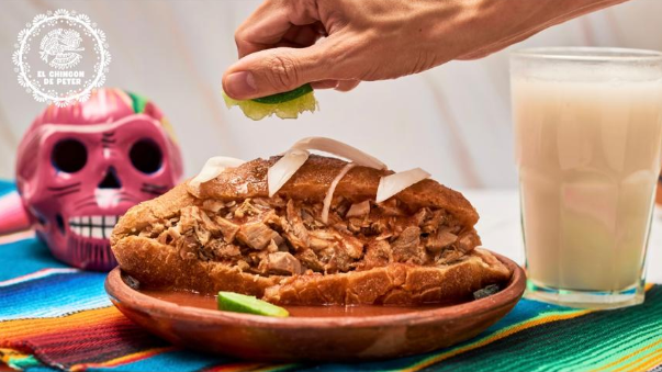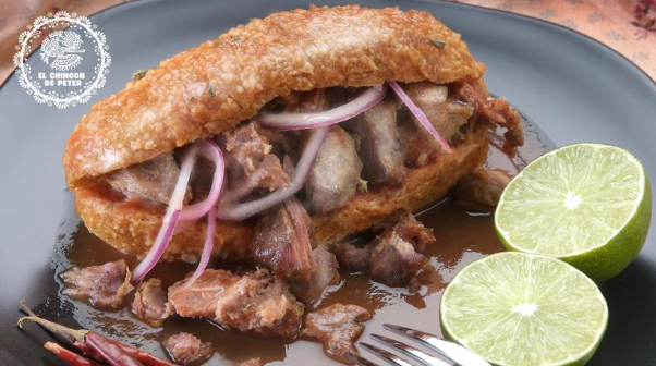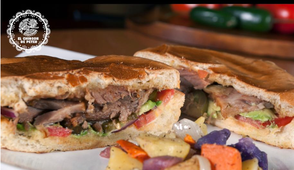 Pan artesanal, porción de chicharrón en trozos, queso mozzarella, trozos de aguacate, cebolla morada encurtida, tomate, salsa de la casa.