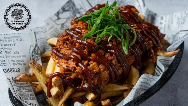 Papas rústicas, porción de carne desmechada, queso mozzarella, huevos, tocineta, salsa de la casa, chorizo.