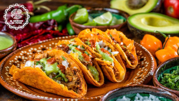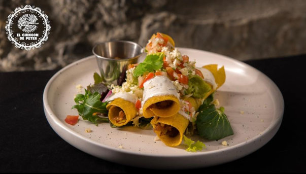 Tortillas de trigo, pollo desmechado, repollo, queso mozzarella, crema agria, aguacate, tomate rojo en cuadros, salsa de la casa.