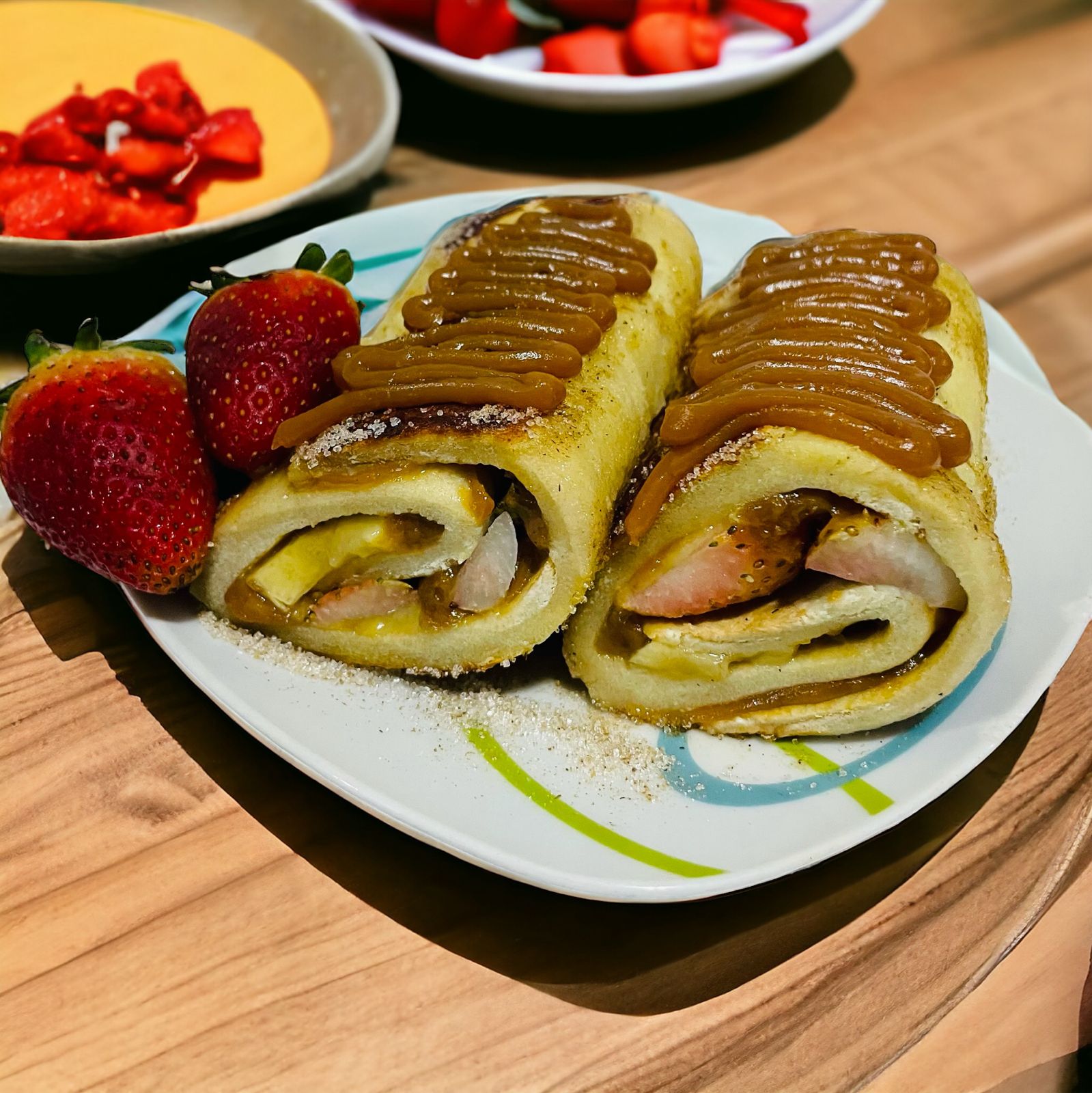 Suave y delicioso pan artesanal apanado, relleno de arequipe, fresas y banano.