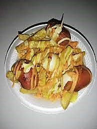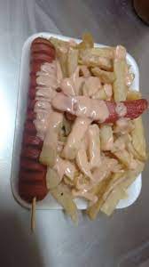 Carne, queso, cebolla, tomate, lechuga, salsas (BBQ, tomate, mayonesa, mostaza, rosada, tartara) y papas cabello de angel.