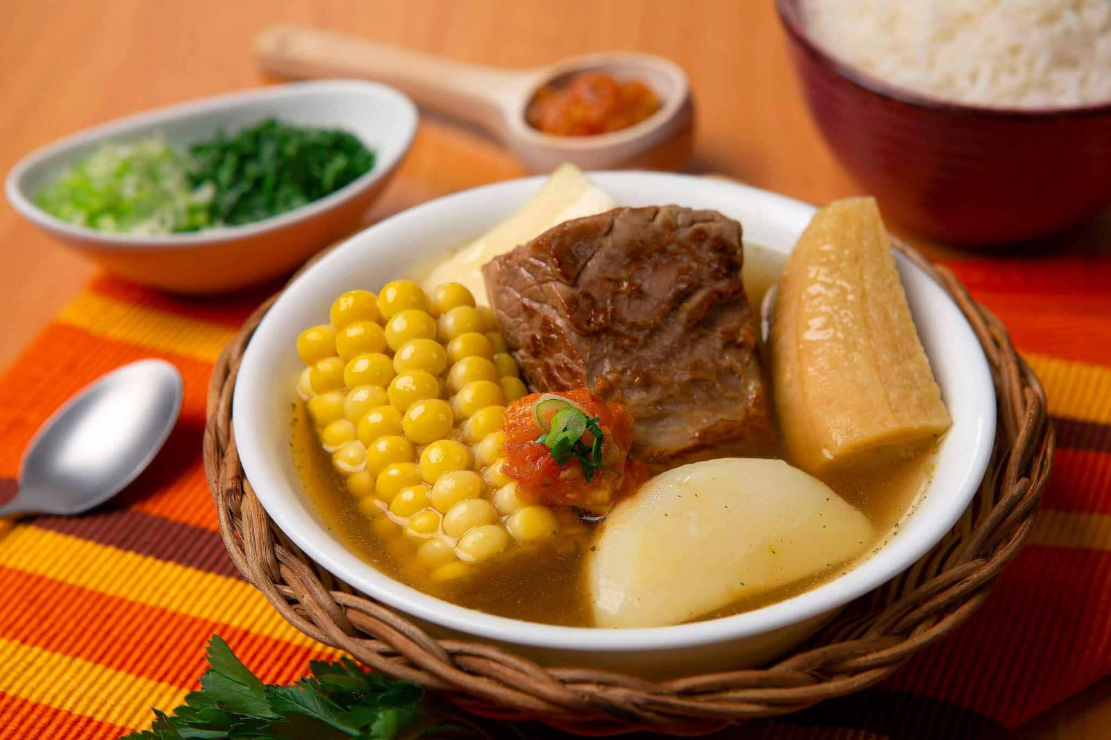 Contiene mondongo, papas picadas, mazorca, cilantro, porción de arroz blanco, aguacate, arepa.