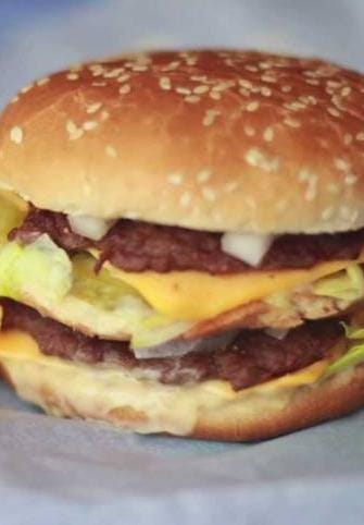 Doble carne, queso, cebolla, tomate, lechuga, salsas (BBQ, tomate, mayonesa, mostaza, rosada, tartara) papas cabello de angel y tocineta.
