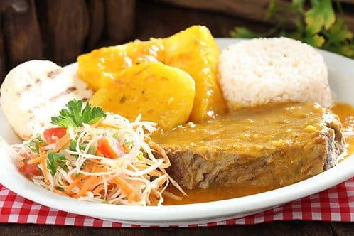 Carne de res, mazorca, platano, papa, yuca, cilantro, arroz blanco, ensalada (lechuga, tomate, cebolla), arepa.