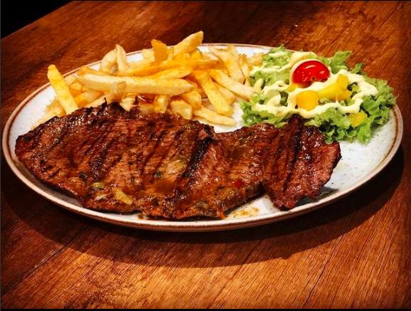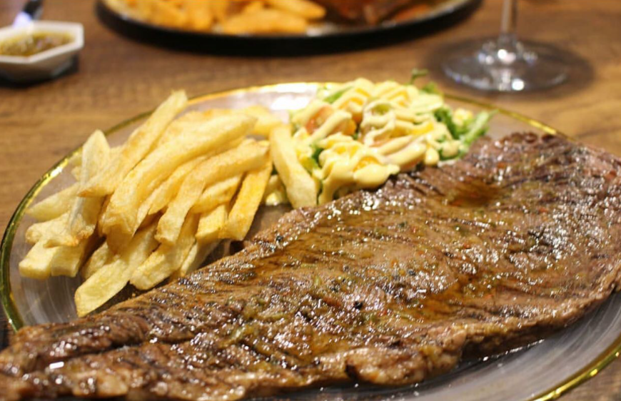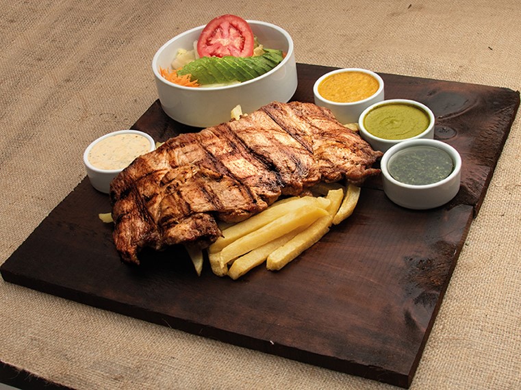 Churrasco + Papa francesa (100 g), ensalada del día, maíz y aderezo de la casa. (Porción personal)