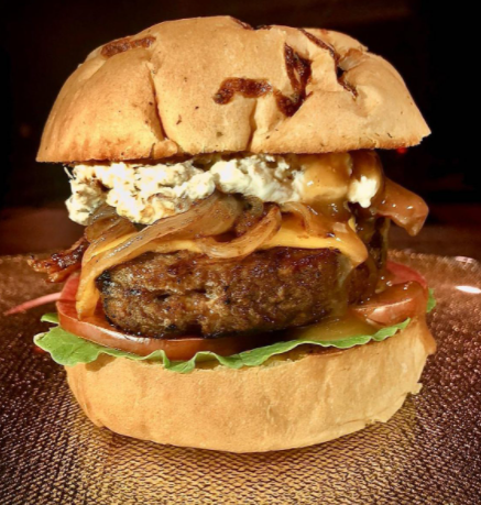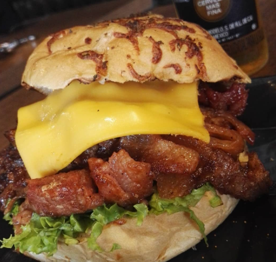 Pan artesanal, Carne de res, Doble queso mozarella, Cebolla caramelizada , lechuga, tocineta, salsas de la casa .