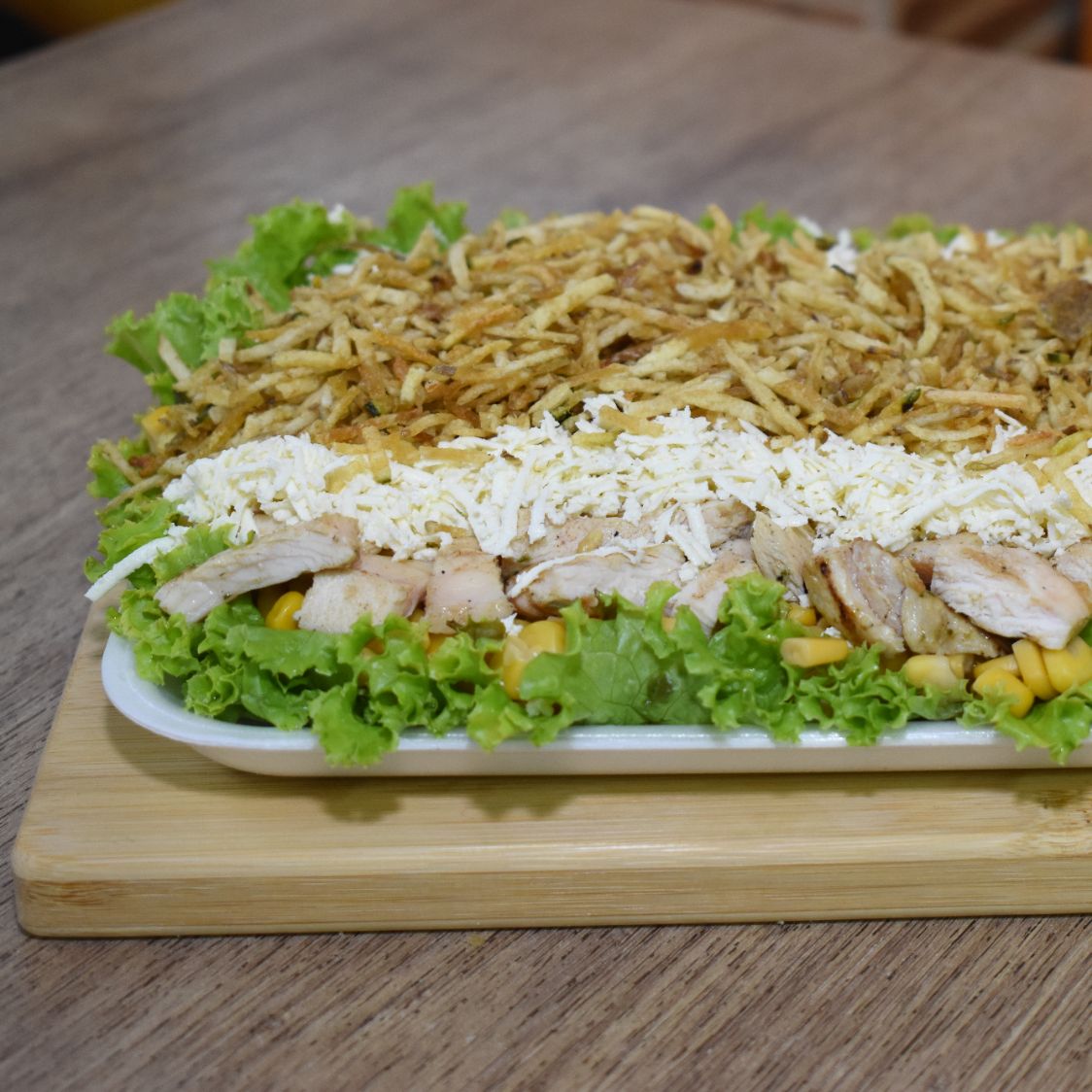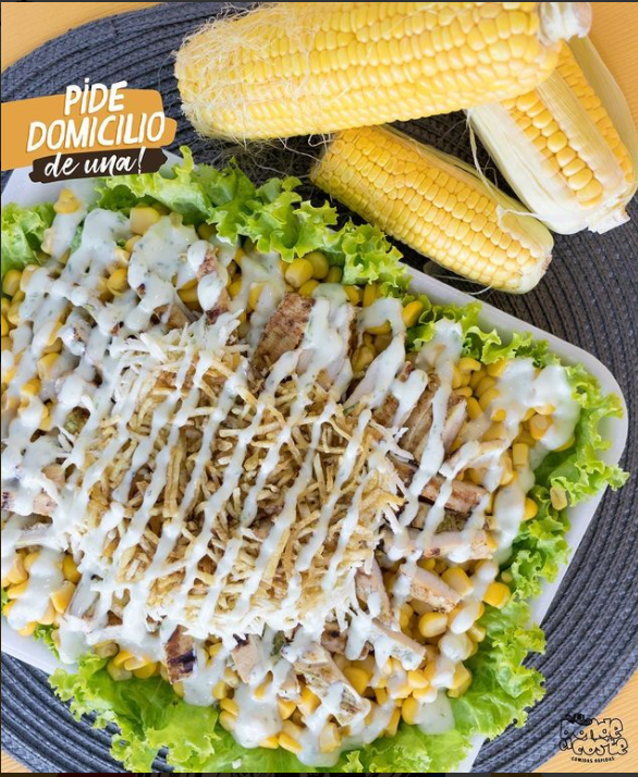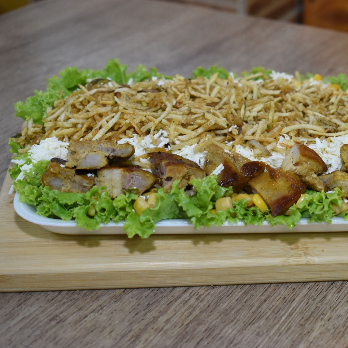 Chuzo de cerdo picado, maicitos, queso rallado, papa ripio, lechuga crespa y salsa de la casa.
