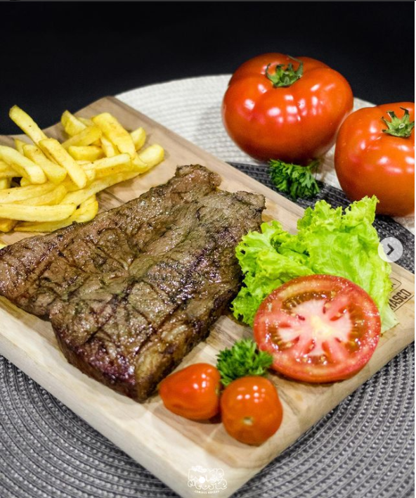 Corte de 280 g, arepa con queso mozzarella, papas a la francesa, lechuga crespa, tomate y salsa de la casa.