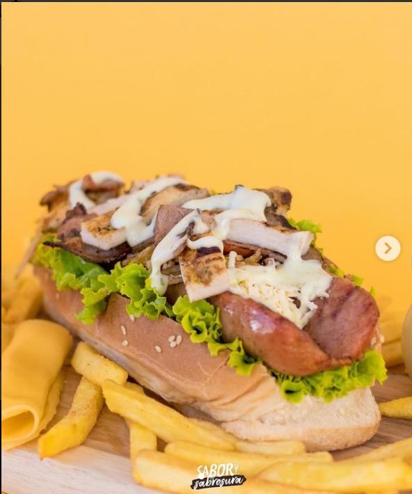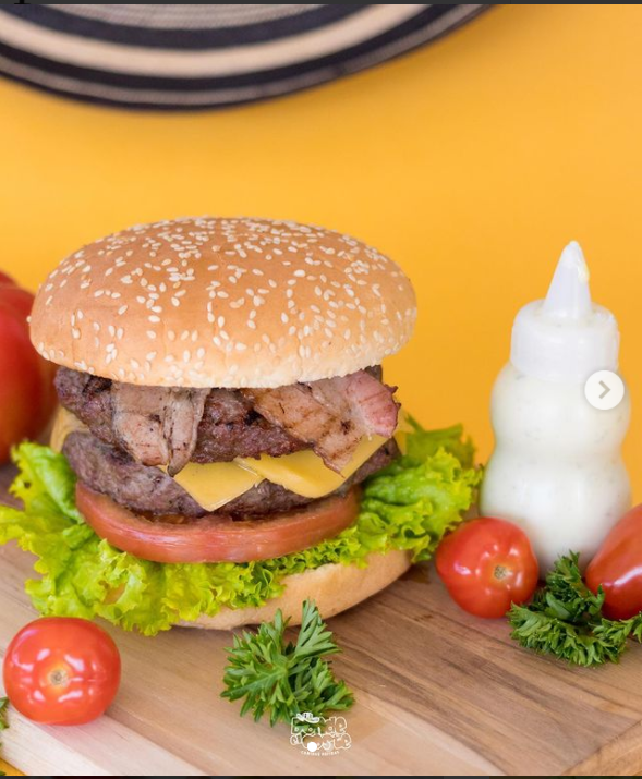 Pan, carne artesanal de 160 g, filete de pollo de 160 g, queso mozzarella, tocineta, lechuga crespa, tomate y salsa de la casa.