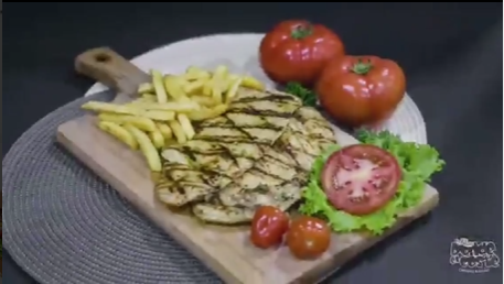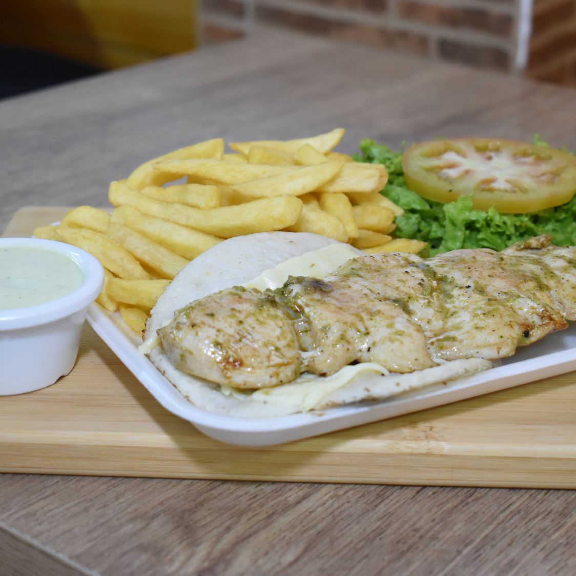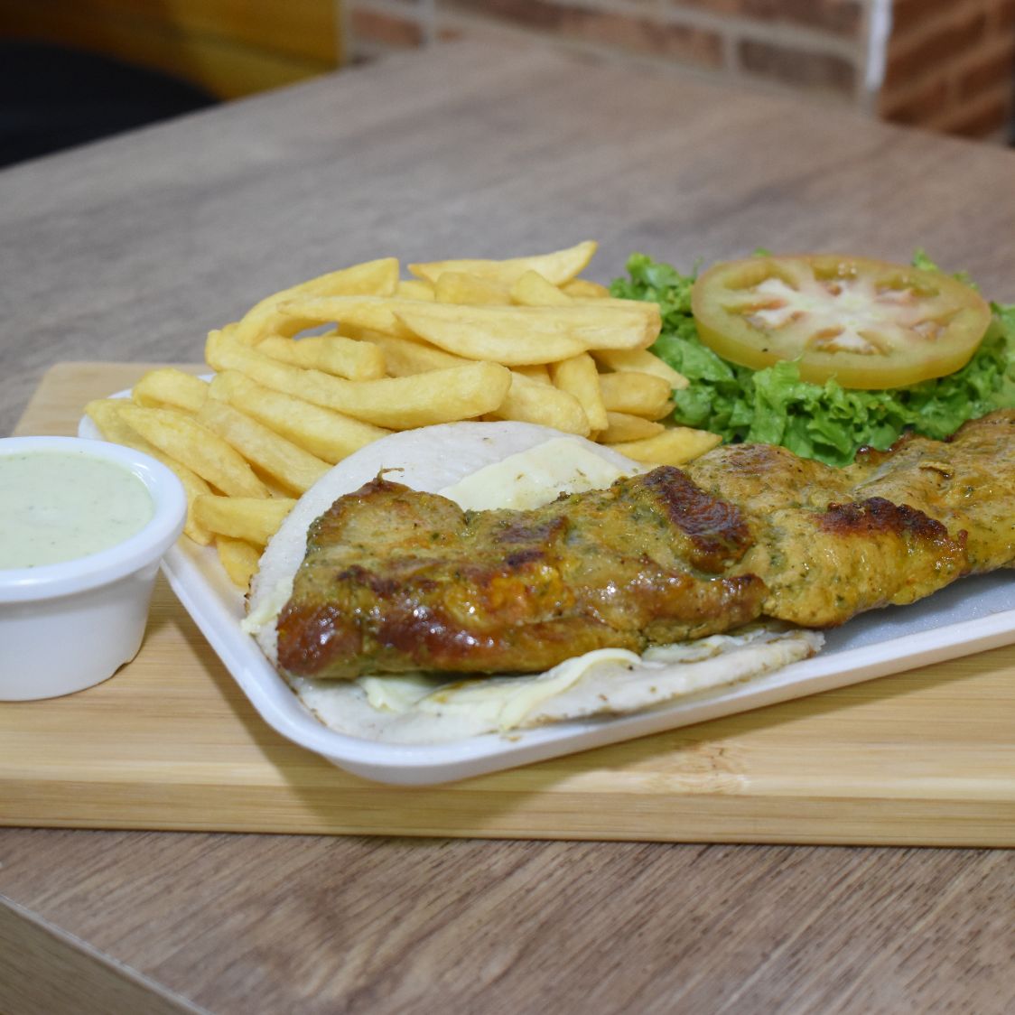 Chuzo de pollo, arepa con queso mozzarella, lechuga crespa, tomate, papas a la francesa y salsa de la casa.