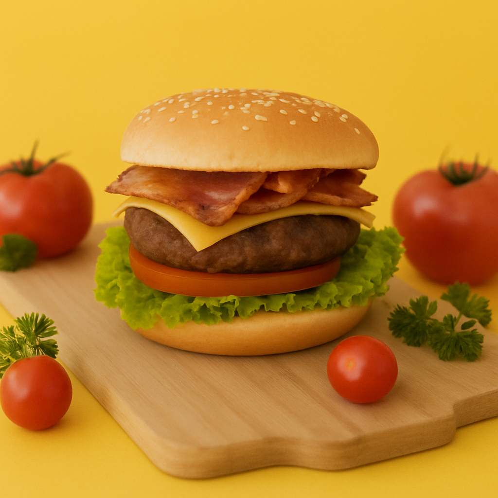 Pan, doble carne artesanal de 160 g, queso mozzarella, tocineta, lechuga crespa, tomate y salsa de la casa.