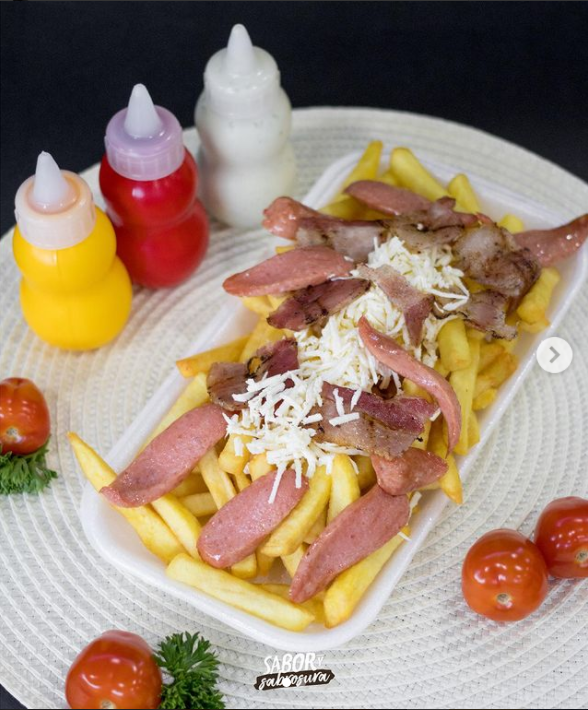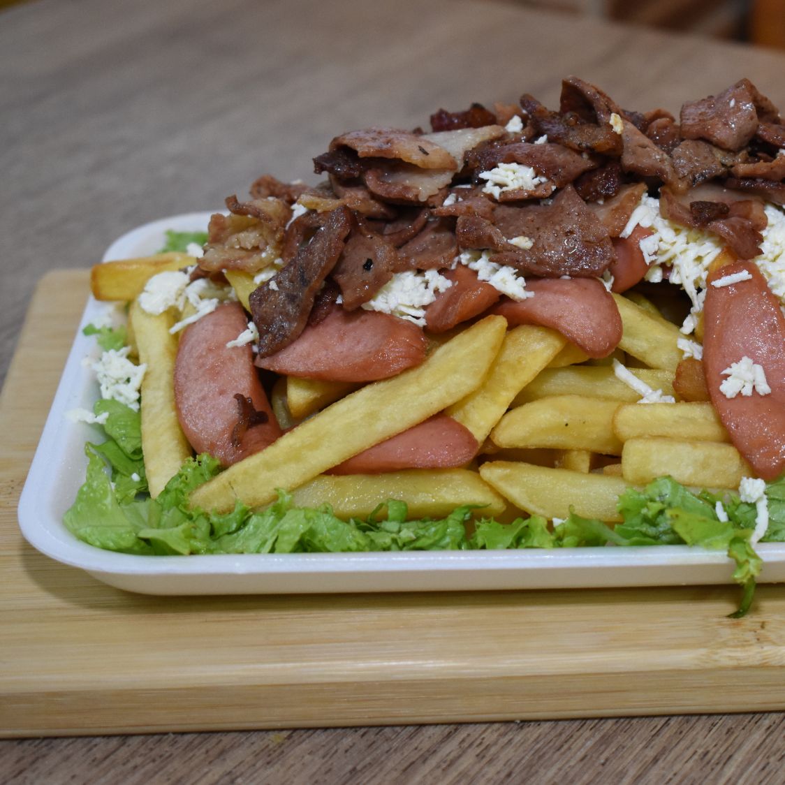 Papas a la francesa, salchicha long Zenú, carne de res desmechada, chorizo, maicitos, queso mozzarella y salsa de la casa.