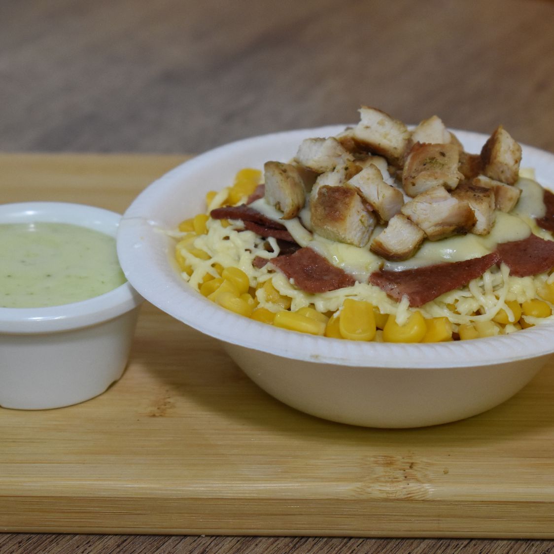 Maicitos, queso rallado, tocineta, pollo, queso mozzarella y salsa de la casa.