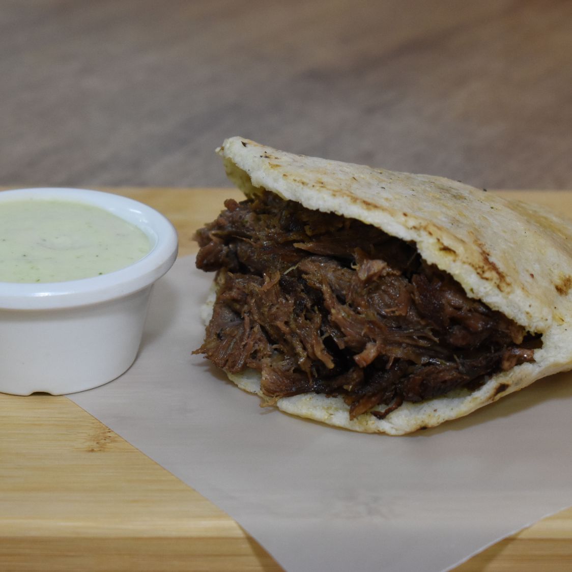 Arepa gruesa, carne de res desmechada, queso mozzarella y salsa de la casa.