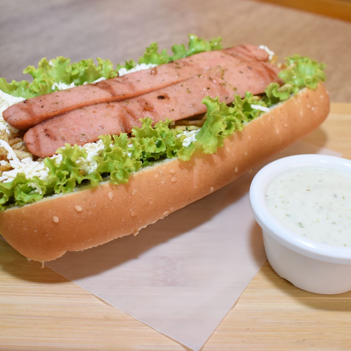 Pan, salchicha long Zenú, queso rallado, papa ripio, lechuga crespa y salsa de la casa.