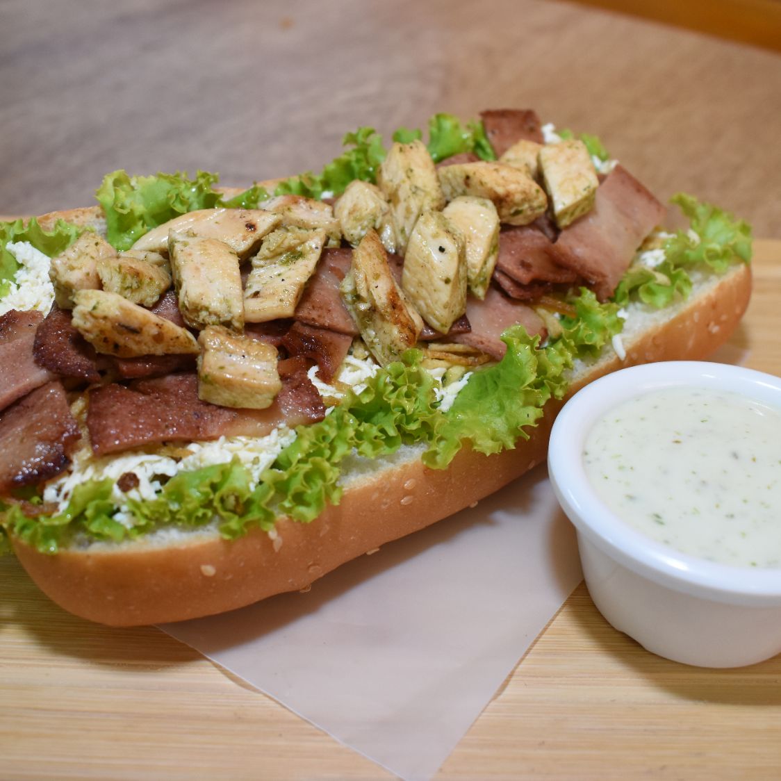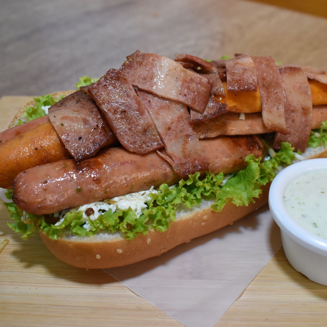 Pan, salchicha long Zenú, queso rallado, tocineta, pollo, papa ripio, lechuga crespa y salsa de la casa.
