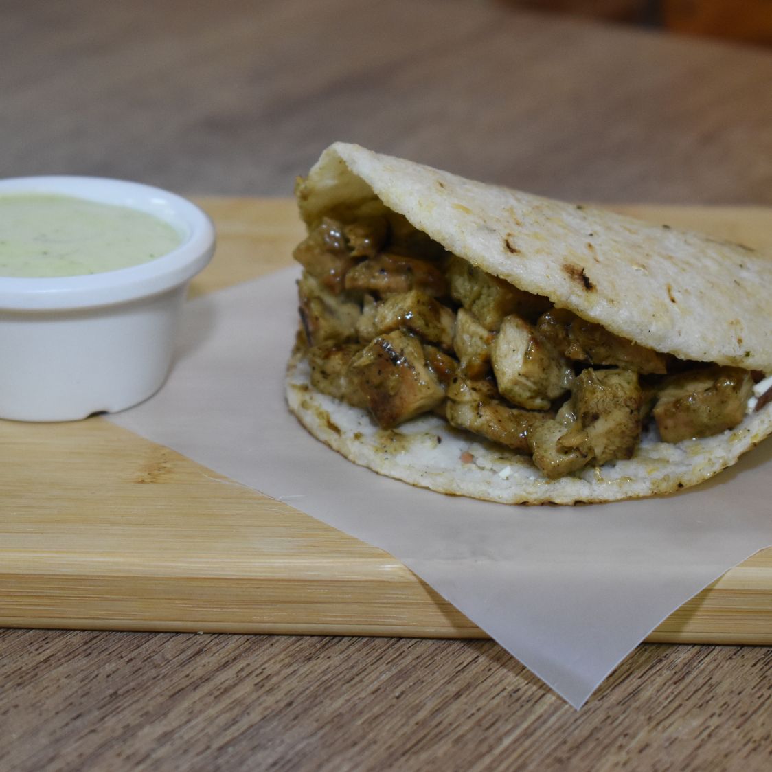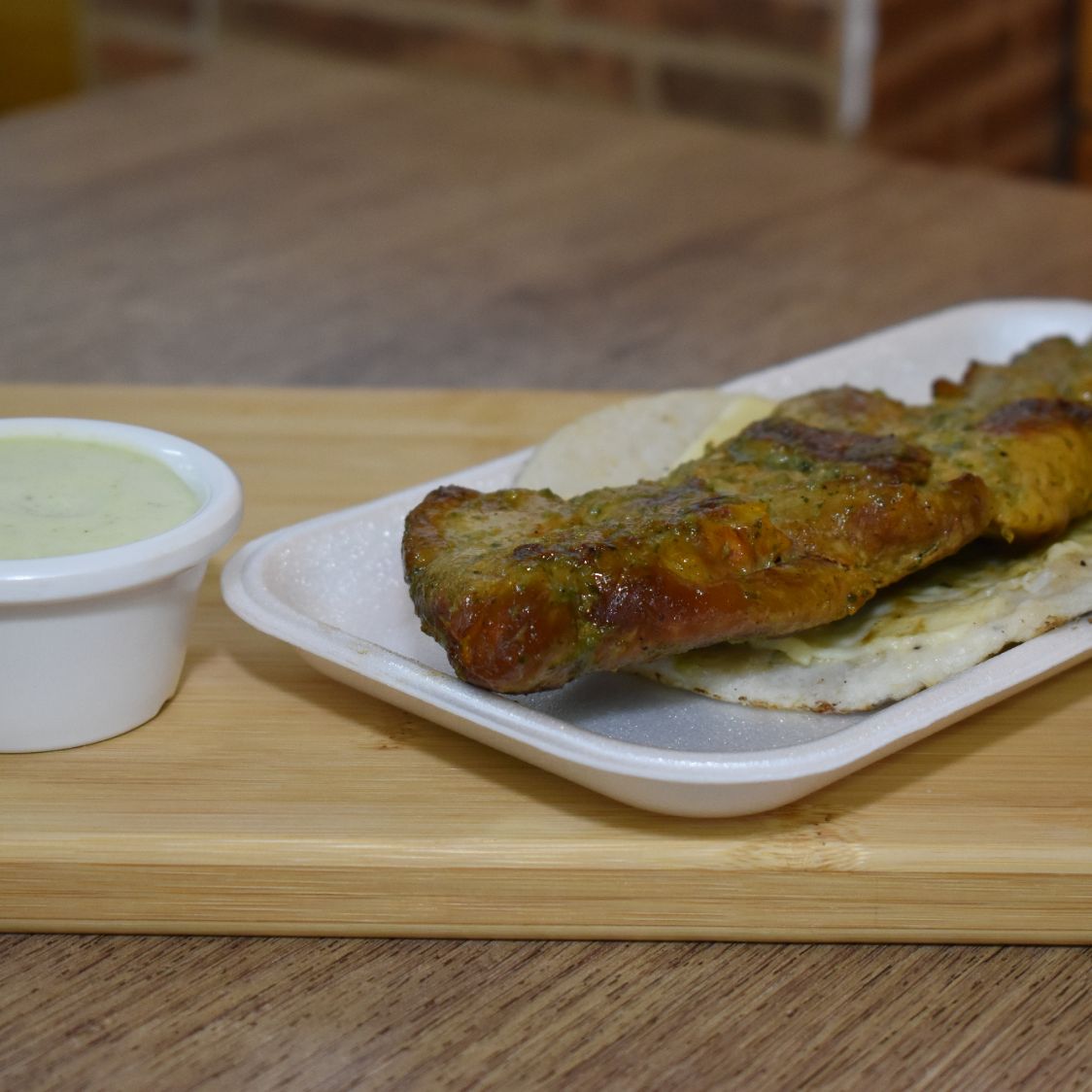 Chuzo de pollo, arepa con queso mozzarella, lechuga crespa, tomate y salsa de la casa.