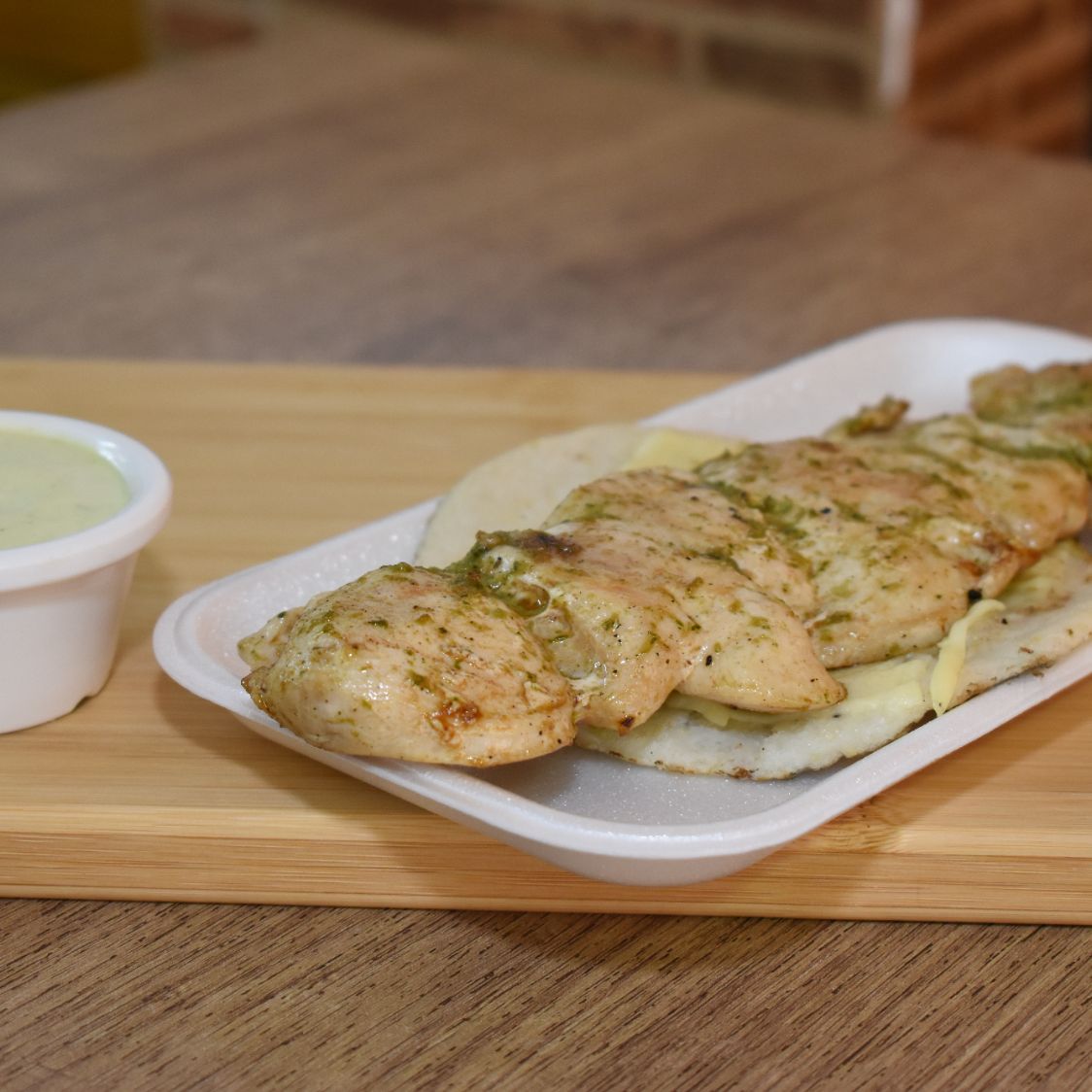 Arepa gruesa, pollo, queso mozzarella y salsa de la casa.