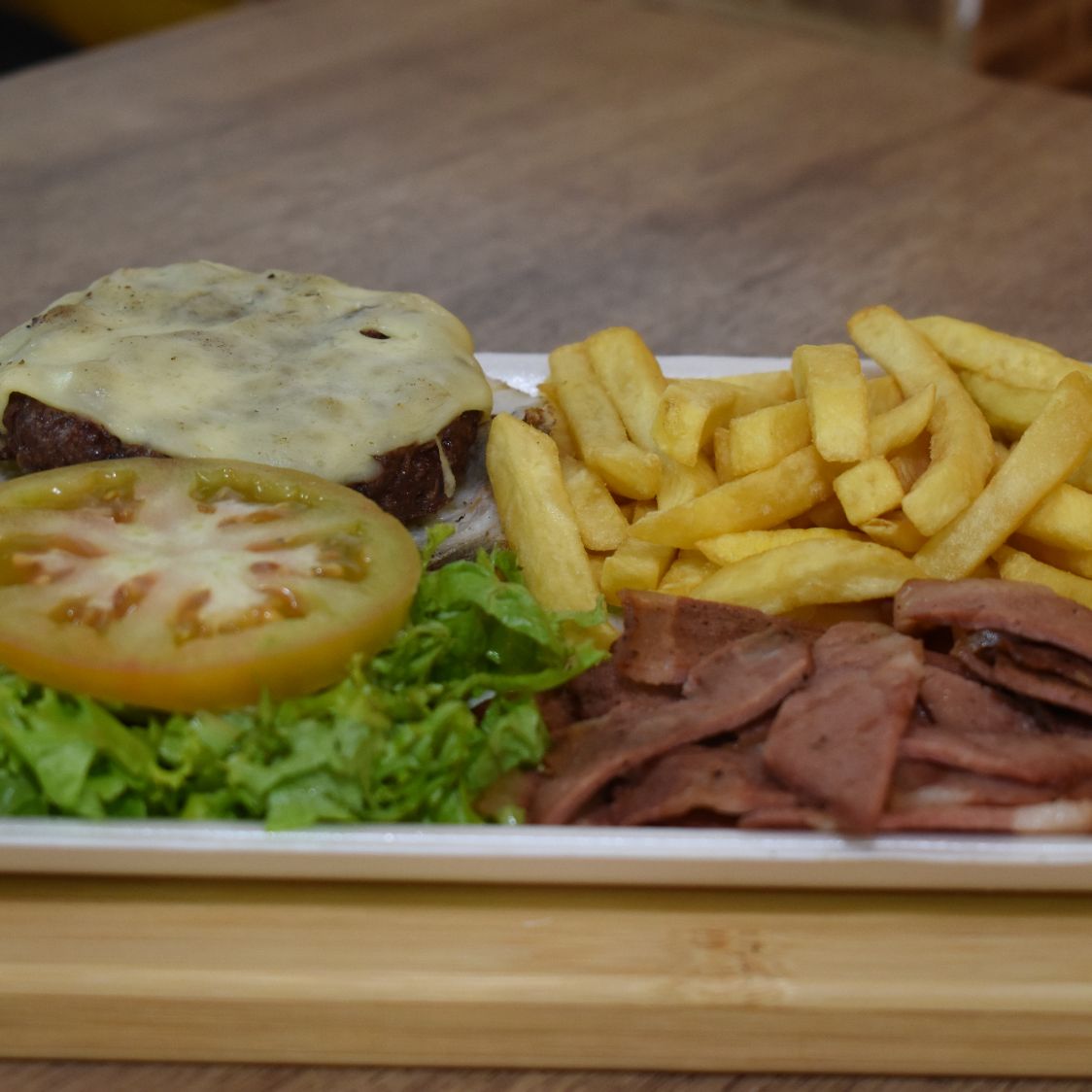 Arepa, carne artesanal de 160 g, queso mozzarella, tocineta, lechuga crespa, tomate, papas a la francesa y salsa de la casa.
