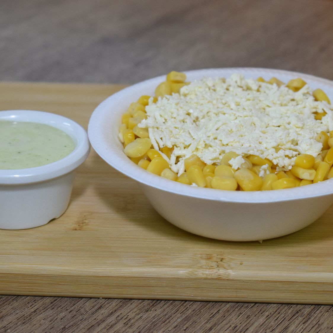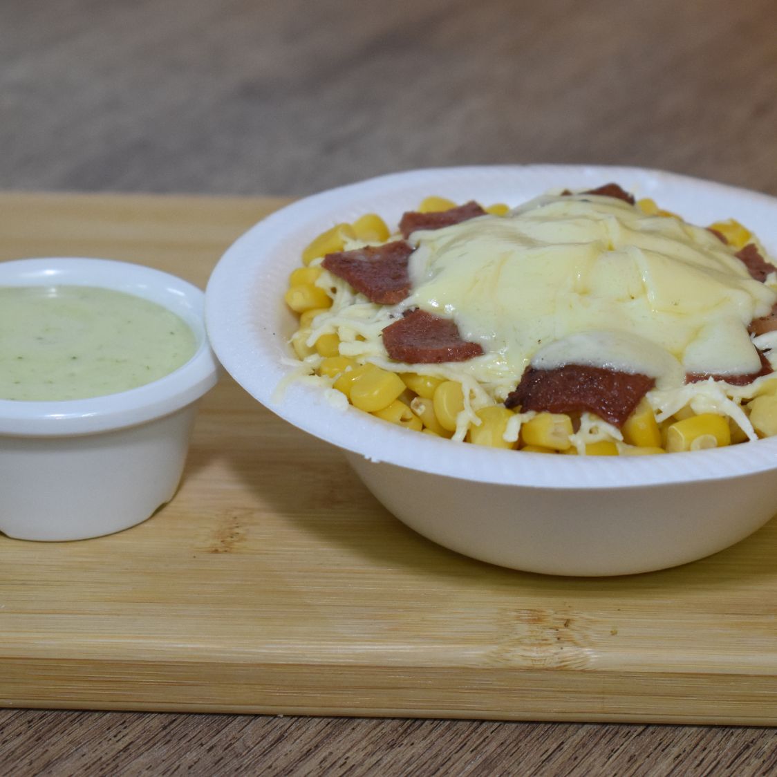 Maicitos, queso rallado, tocineta y salsa de la casa.