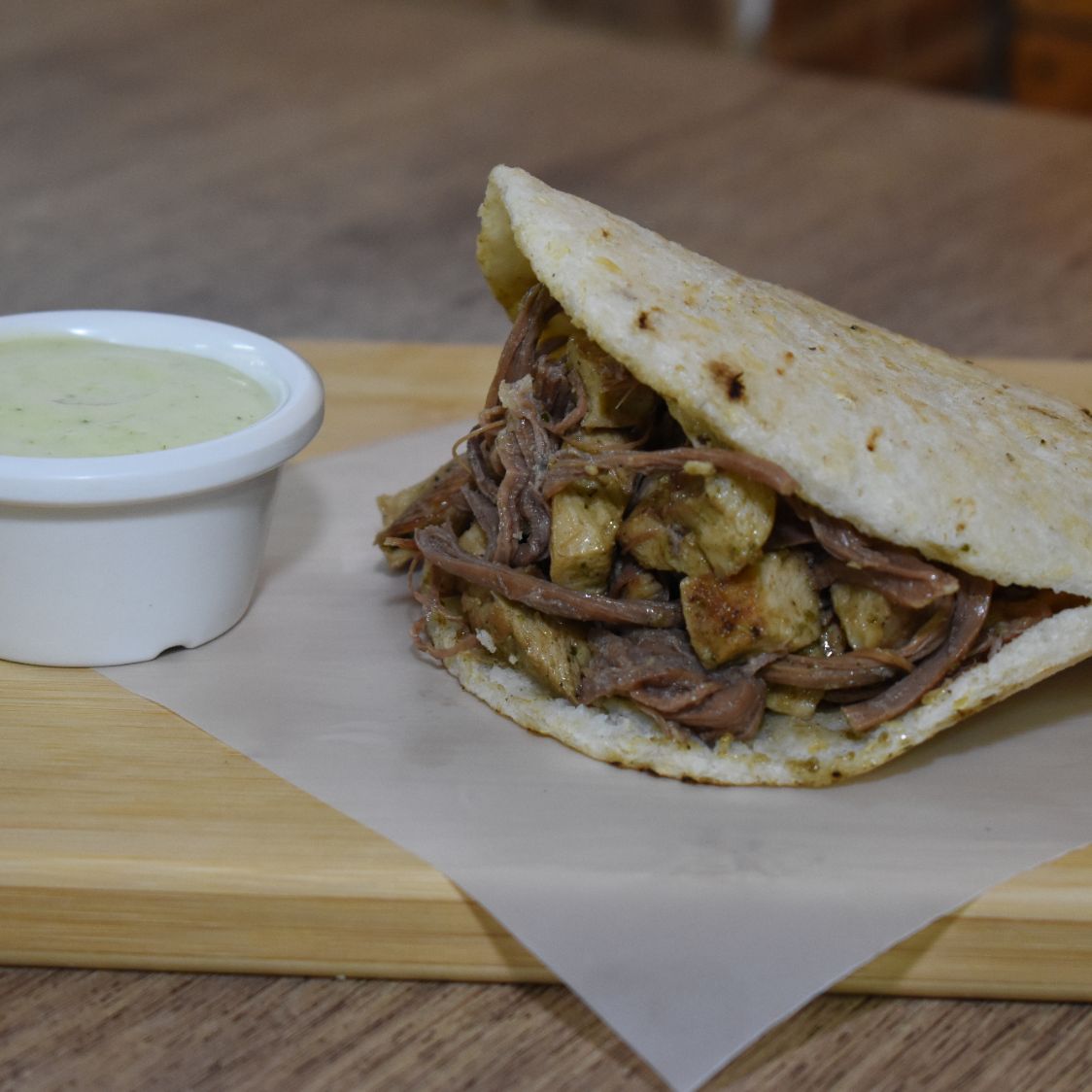 Arepa gruesa, carne de res desmechada, pollo, queso mozzarella y salsa de la casa.