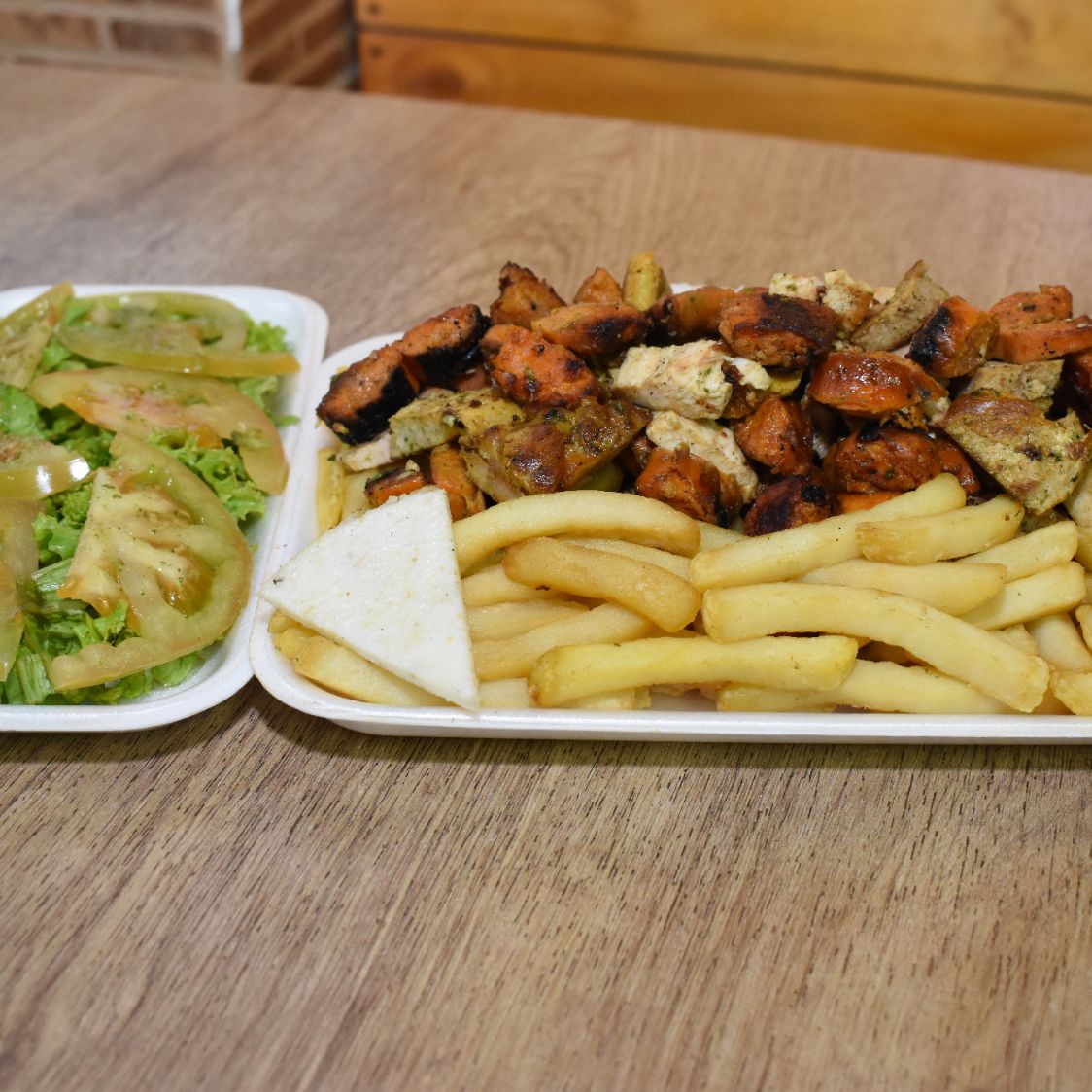 Chuzo de pollo, chuzo de cerdo, chorizo, arepa con queso mozzarella, papa a la francesa, lechuga crespa, tomate y salsa de la casa.
