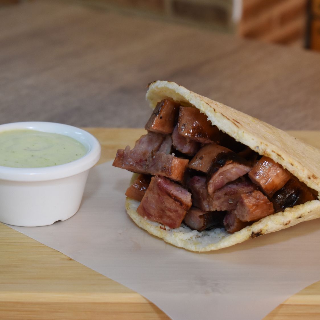 Chuzo de cerdo, arepa con queso mozzarella, lechuga crespa, tomate y salsa de la casa.