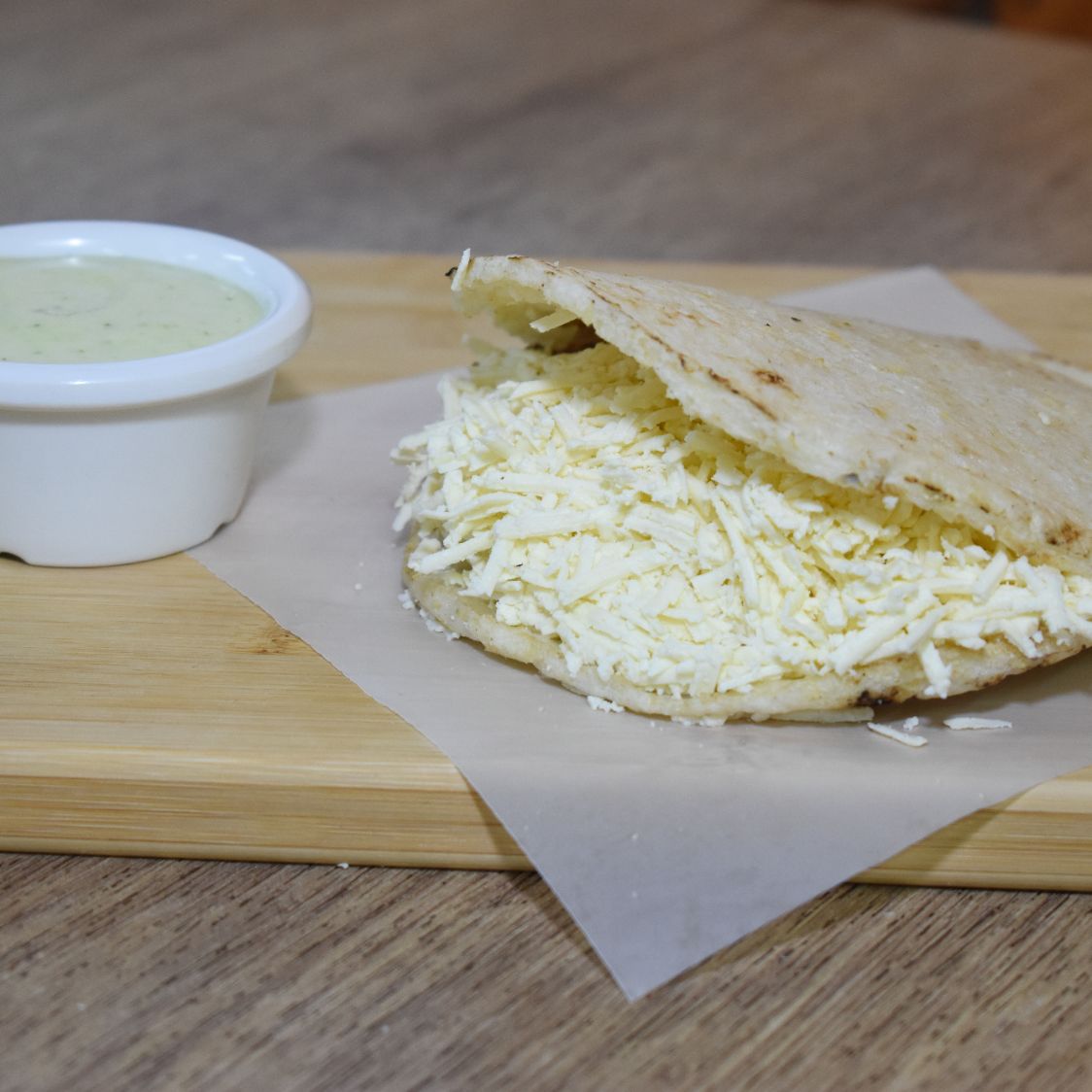 Arepa gruesa, queso rallado, queso mozzarella y salsa de la casa.